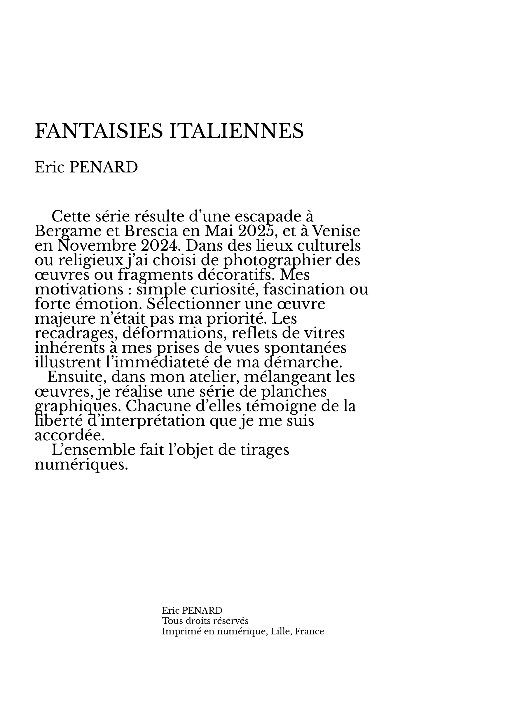 Cette série résulte d’une escapade à Bergame et Brescia en Mai 2025, et à Venise en Novembre 2024. Dans des lieux culturels ou religieux j’ai choisi de photographier des œuvres ou fragments décoratifs. Mes motivations : simple curiosité, fascination ou forte émotion. Sélectionner une œuvre majeure n’était pas ma priorité. Les recadrages, déformations, reflets de vitres inhérents à mes prises de vues spontanées illustrent l’immédiateté de ma démarche.