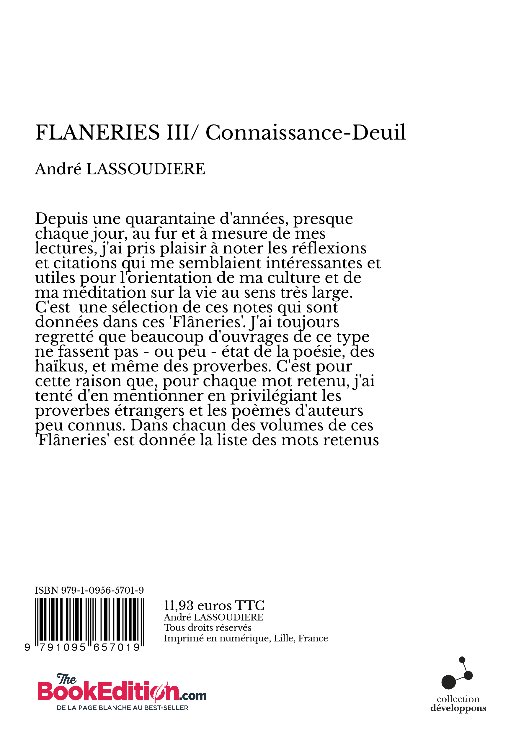 Depuis une quarantaine d'années, presque chaque jour, au fur et à mesure de mes lectures, j'ai pris plaisir à noter les réflexions et citations qui me semblaient intéressantes et utiles pour l'orientation de ma culture et de ma méditation sur la vie au sens très large. C'est une sélection de ces notes qui sont données dans ces 'Flâneries'. J'ai toujours regretté que beaucoup d'ouvrages de ce type ne fassent pas - ou peu - état de la poésie, des haïkus, et même des proverbes. C'est pour cette raison que, pour chaque mot retenu, j'ai tenté d'en mentionner en privilégiant les proverbes étrangers et les poèmes d'auteurs peu connus. Dans chacun des volumes de ces 'Flâneries' est donnée la liste des mots retenus (et les mots de signification voisine) ainsi que l'indication des renvois pour des mots de sens proche.