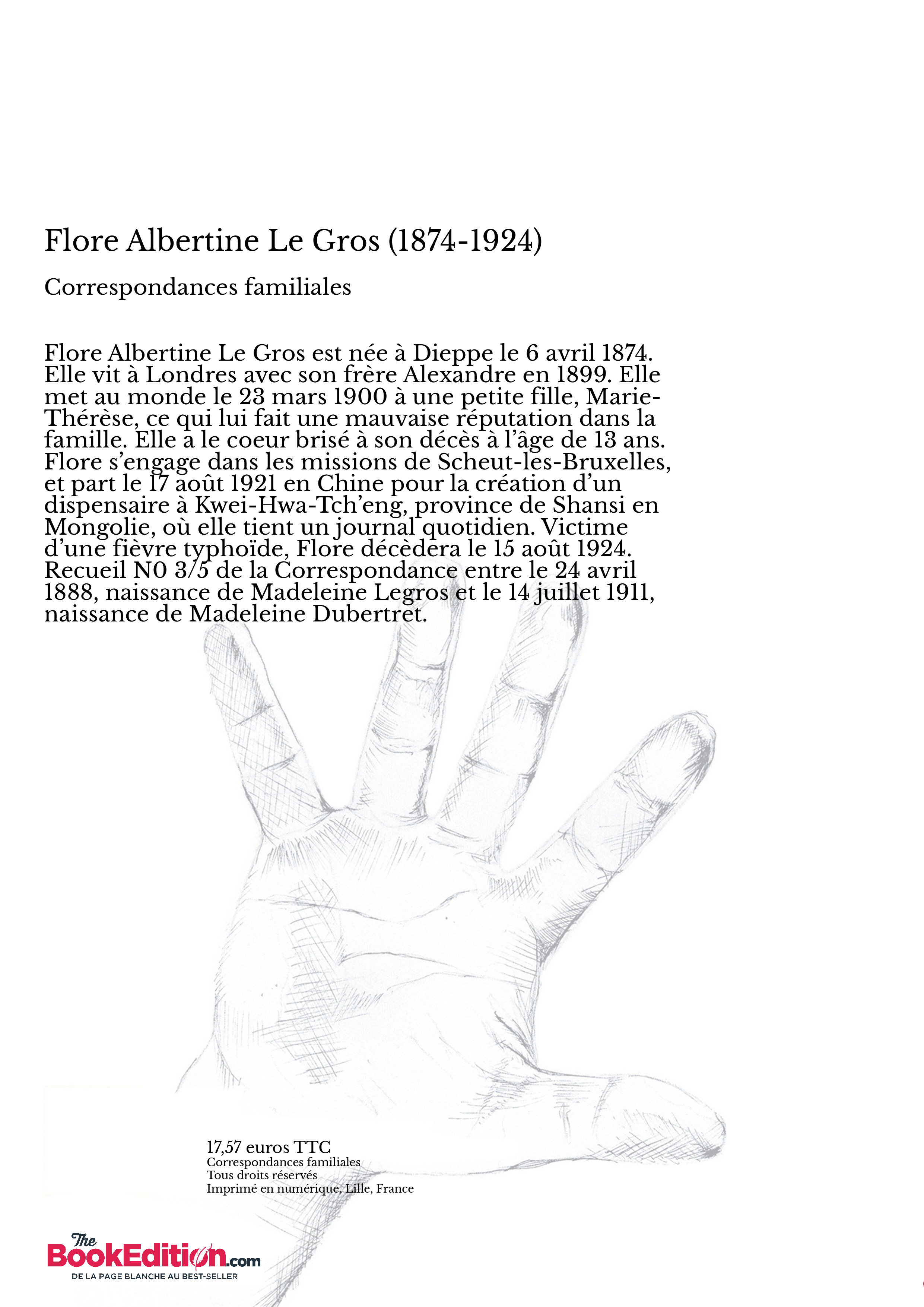 Flore Albertine Le Gros est née à Dieppe le 6 avril 1874. Elle vit à Londres avec son frère Alexandre en 1899. Elle met au monde le 23 mars 1900 à une petite fille, Marie-Thérèse, ce qui lui fait une mauvaise réputation dans la famille. Elle a le coeur brisé à son décès à l’âge de 13 ans. Flore s’engage dans les missions de Scheut-les-Bruxelles, et part le 17 août 1921 en Chine pour la création d’un dispensaire à Kwei-Hwa-Tch’eng, province de Shansi en Mongolie, où elle tient un journal quotidien. Victime d’une fièvre typhoïde, Flore décèdera le 15 août 1924.