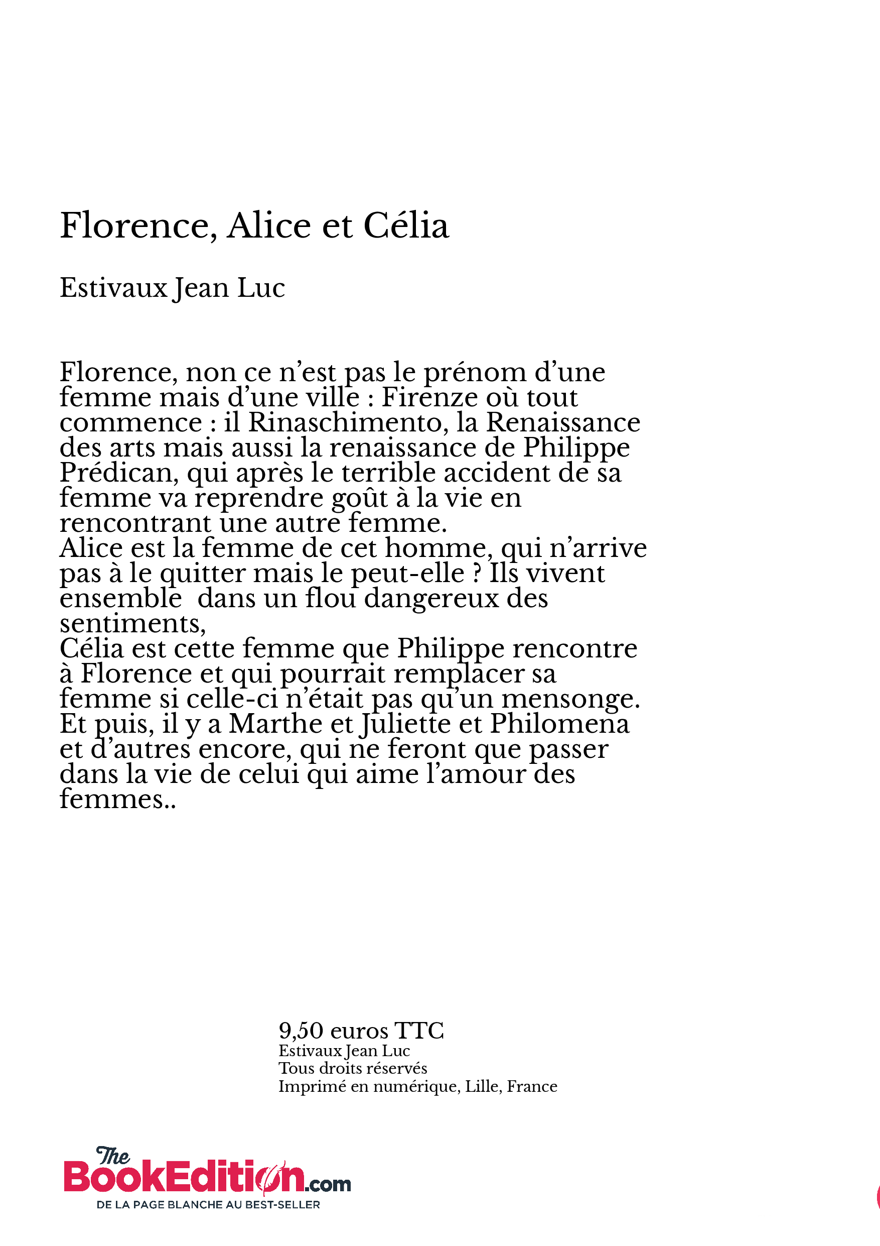 Florence, non ce n’est pas le prénom d’une femme mais d’une ville : Firenze où tout commence : il Rinaschimento, la Renaissance des arts mais aussi la renaissance de Philippe Prédican, qui après le terrible accident de sa femme va reprendre goût à la vie en rencontrant une autre femme.