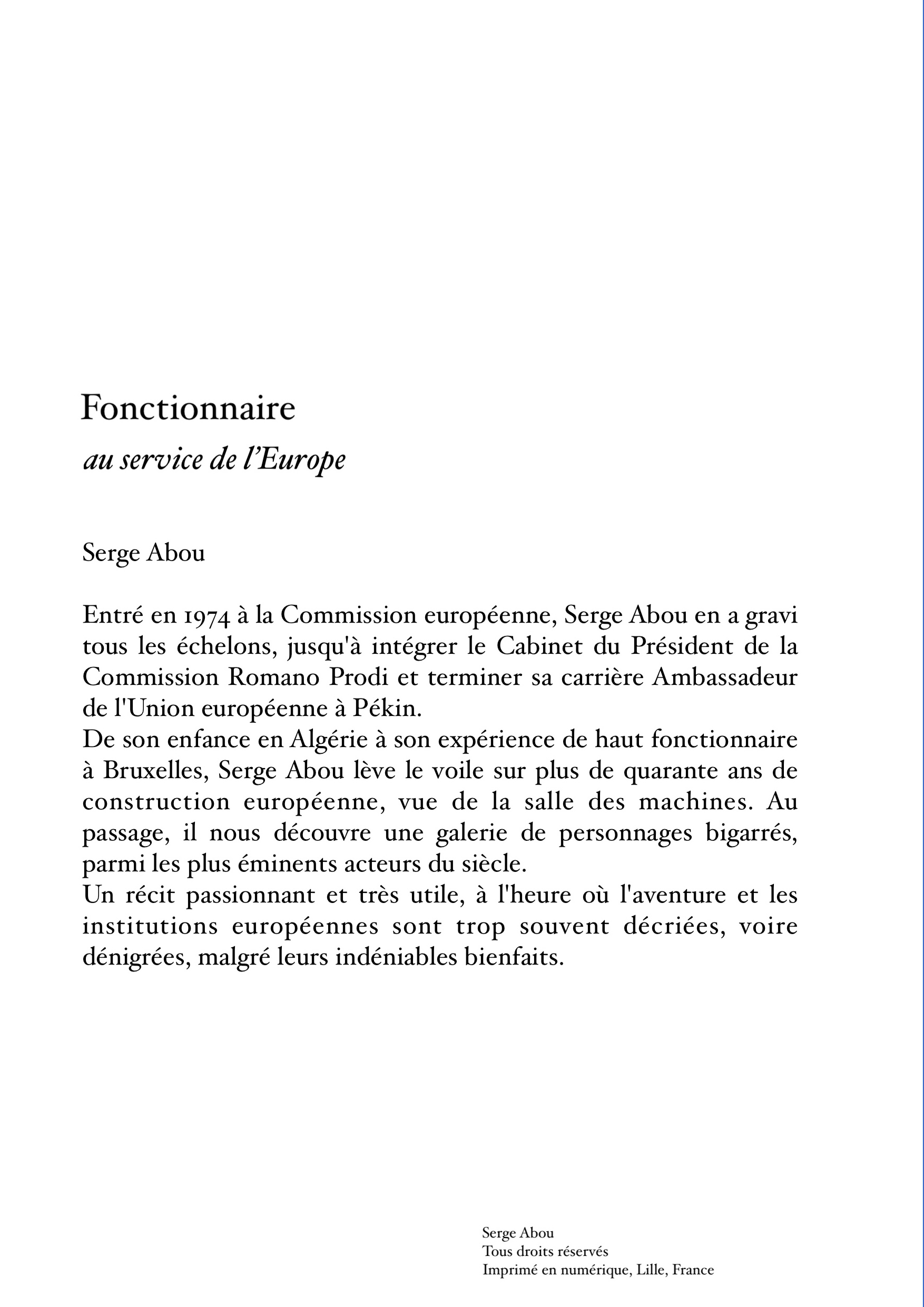 De sa enfance en Algérie à son expérience de haut fonctionnaire à Bruxelles, Serge Abou lève le voile sur plus de quarante ans de construction européenne, vue de la salle des machines. Au passage, il nous découvre une galerie de personnages, parmi les plus éminents acteurs du siècle.