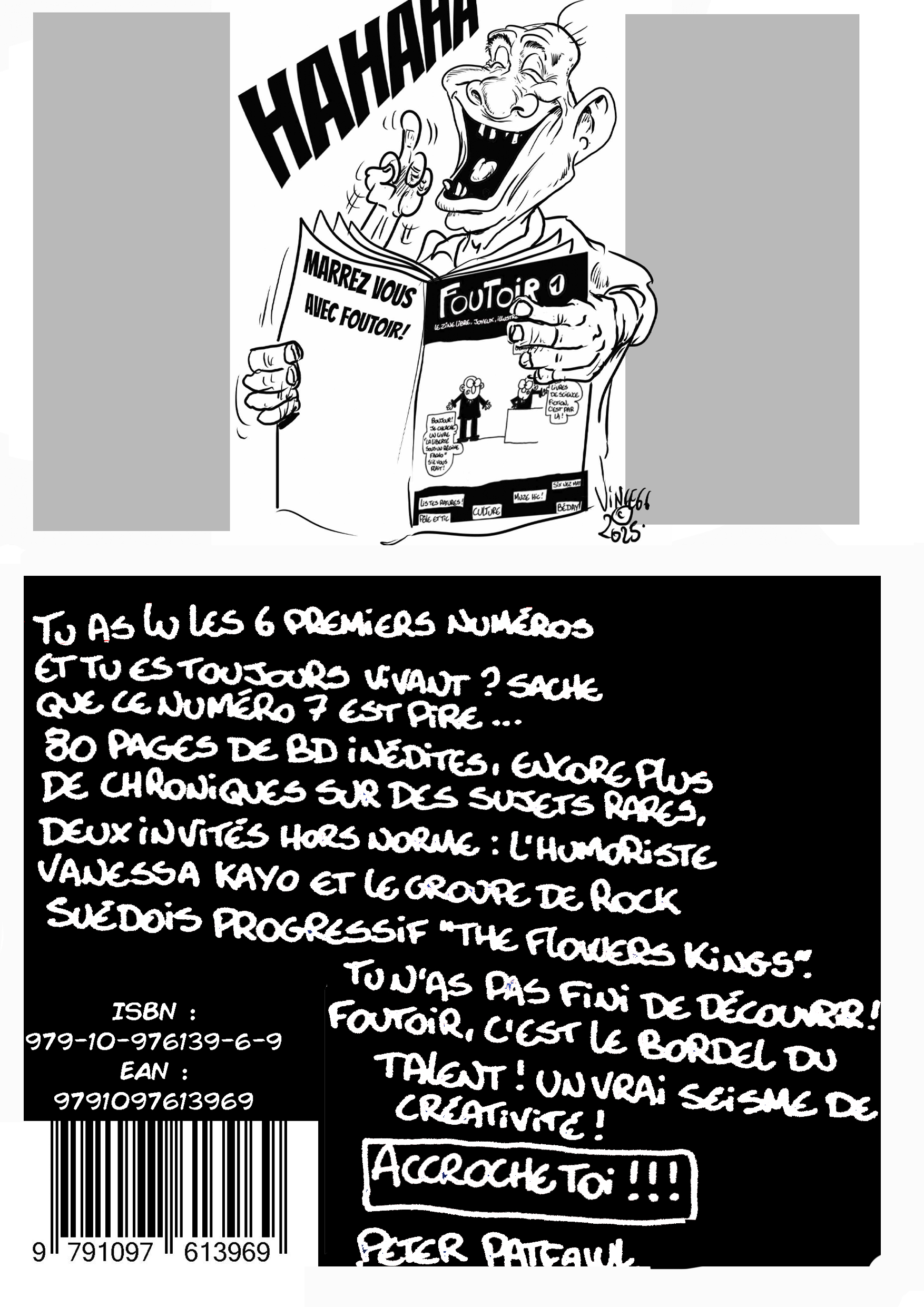 Nous y voilà ! Le numéro 7 de Foutoir, le fanzine 50 % Bandes Dessinées inédites (Projets refusés, BD crées pour l'occasion) avec des travaux de Pascal Craveri, Saynot, Lou, Mantedouce, Pfägen, Jak, Thiriet, Graffica, Vince, Creseveur et Peter Patfawl. Et 50 % de chroniques culturelles sur des sujets non-médiatisés. Et deux intervious exclusives du groupe de rock "The Flower Kings" et de l'humoriste Vanessa Kayo. 100 Pages de joies, de folies créatives et de liberté !!! Soyez donc nombreux à lire ce numéro explosif qui gagne à être connu ! (Vous pouvez aujourd'hui vous procurer les numéros en librairie sur commande, sur Thebookedition directement ou sur la E-boutique de Peter Patfawl. )