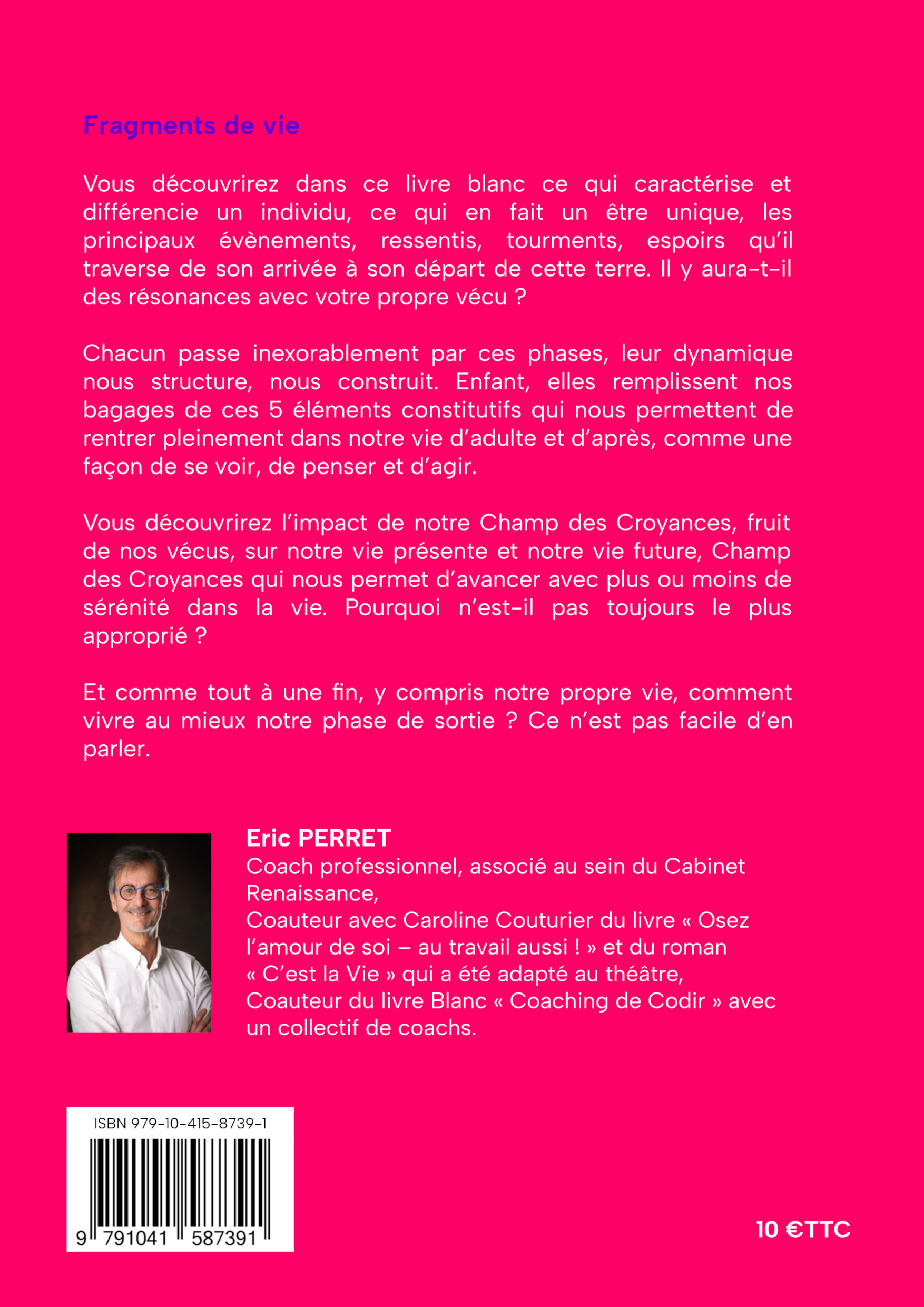 Ce livre mêle introspection, fiction et expérience vécue, Éric Perret explore les dynamiques invisibles qui façonnent nos vies, des bagages dont on hérite à notre naissance aux étapes structurantes de nos parcours d’enfant, d’adolescent, d’adulte jusqu’à notre départ de cette terre ; de l’impact et de la (dé)construction de nos croyances – souvent limitantes - qui se sont développées via nos injonctions, nos blessures et le résultat de nos choix.