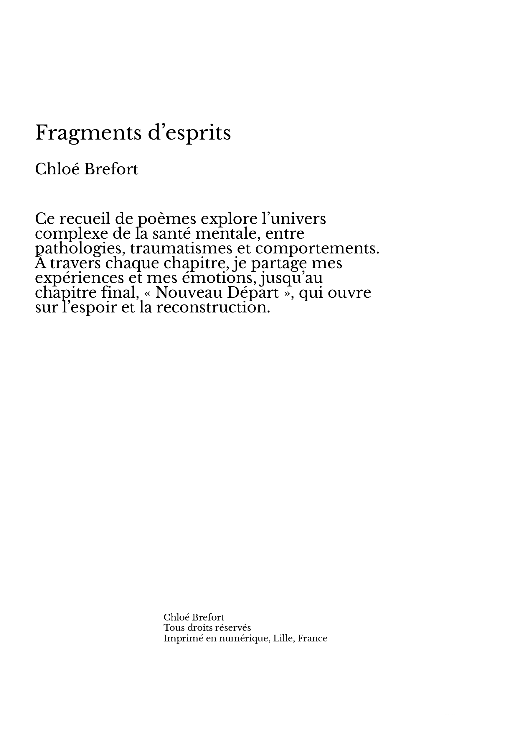 Je m’appelle Chloé Brefort et je suis passionnée par la poésie et la santé mentale. Après avoir traversé des périodes difficiles, marquées par la dépression, l’anxiété et les troubles alimentaires, j’ai choisi de transformer mon expérience en mots. Dans ce recueil, j’explore les pathologies, les traumatismes, les comportements et le chemin vers un nouveau départ, avec sensibilité et authenticité.