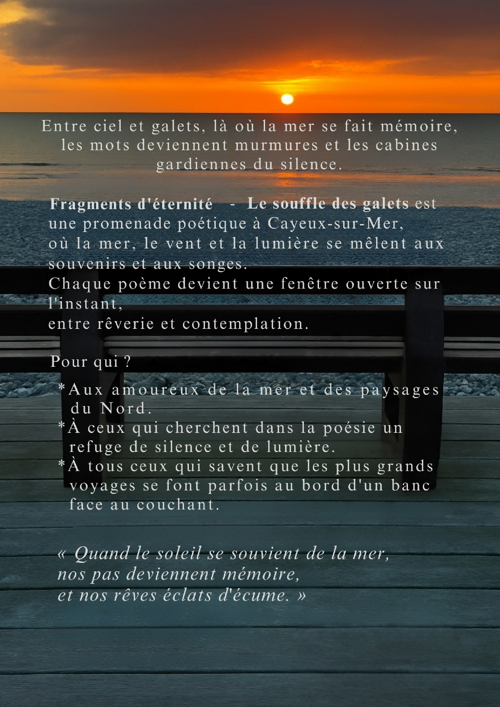 Entre ciel et galets, là où la mer se fait mémoire, les mots deviennent murmures et les cabines gardiennes du silence. Ce recueil est une promenade poétique à Cayeux-sur-Mer, un lieu où chaque souffle devient un poème. François Savreux tisse un univers intime et universel, où la mer devient miroir de l’âme. Chaque texte invite à ralentir, ressentir, rêver, dans un voyage intérieur au bord du silence. Un livre pour ceux qui cherchent dans la poésie un refuge de lumière et de sérénité.