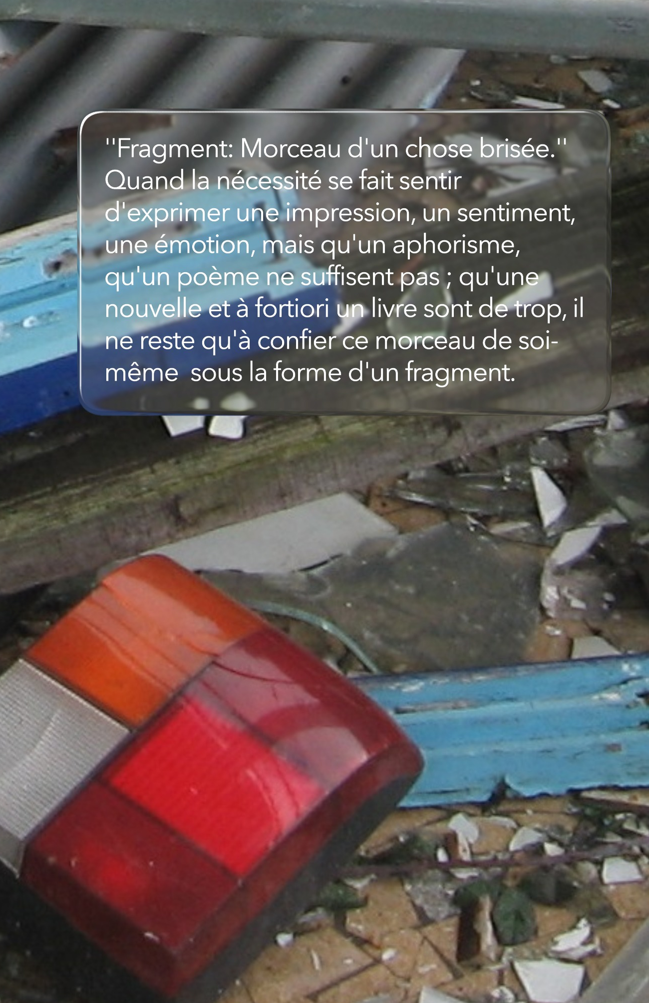 ''Fragment: Morceau d'un chose brisée.'' Quand la nécessité se fait sentir d'exprimer une impression, un sentiment, une émotion, mais qu'un aphorisme, qu'un poème ne suffisent pas ; qu'une nouvelle et à fortiori un livre sont de trop, il ne reste qu'à confier ce morceau de soi-même sous la forme d'un fragment. C'est ce que je me suis proposé, en commettant deux tomes de ce que m'ont inspirées mes rencontres au détour de mes pérégrinations errantes en tous genres, au travers des réflexions, des lieux, des temps, des jeux de l'imagination, poétiquement toujours aussi et toujours en tentant de rester vrai.