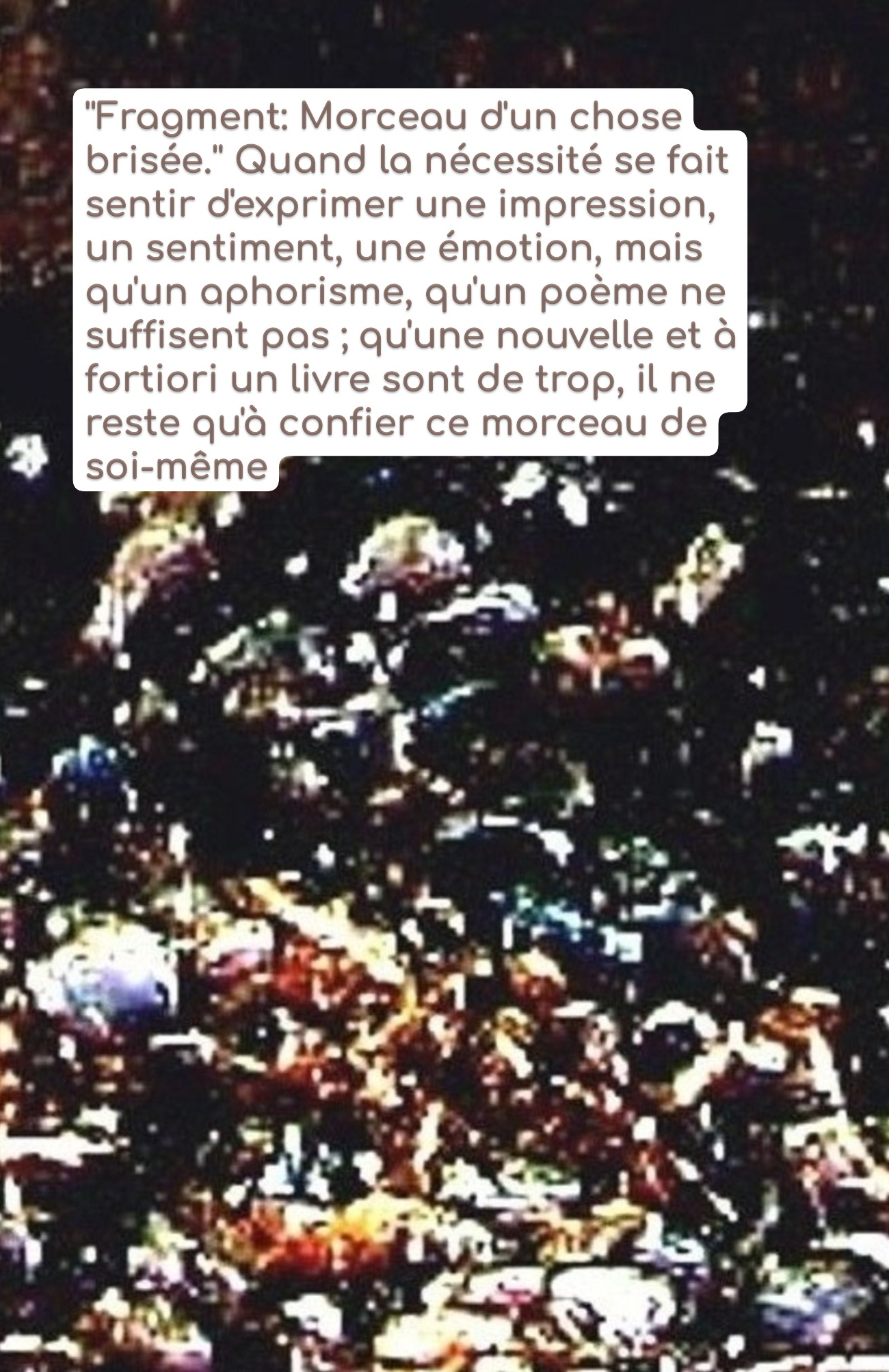 ''Fragment: Morceau d'un chose brisée.'' Quand la nécessité se fait sentir d'exprimer une impression, un sentiment, une émotion, mais qu'un aphorisme, qu'un poème ne suffisent pas ; qu'une nouvelle et à fortiori un livre sont de trop, il ne reste qu'à confier ce morceau de soi-même sous la forme d'un fragment. C'est ce que je me suis proposé, en commettant deux tomes de ce que m'ont inspirées mes rencontres au détour de mes pérégrinations errantes en tous genres, au travers des réflexions, des lieux, des temps, des jeux de l'imagination, poétiquement toujours aussi et toujours en tentant de rester vrai.