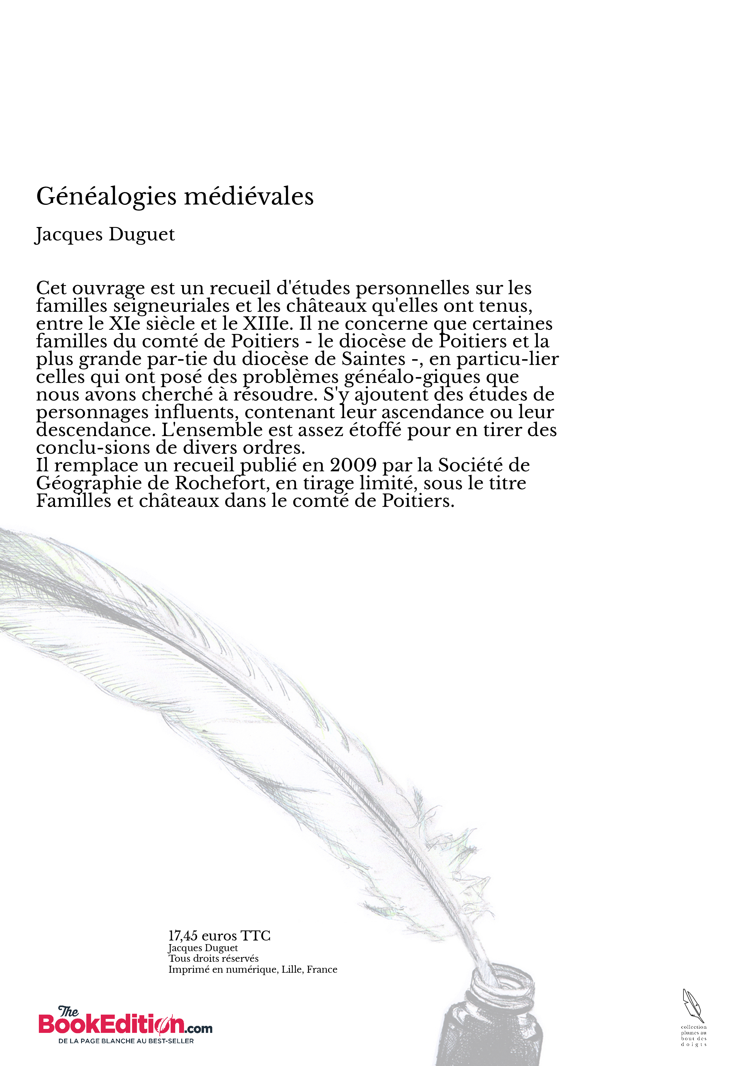 Cet ouvrage est un recueil d'études personnelles sur les familles seigneuriales et les châteaux qu'elles ont tenus, entre le XIe siècle et le XIIIe. Il ne concerne que certaines familles du comté de Poitiers - le diocèse de Poitiers et la plus grande par-tie du diocèse de Saintes -, en particu-lier celles qui ont posé des problèmes généalo-giques que nous avons cherché à résoudre. S'y ajoutent des études de personnages influents, contenant leur ascendance ou leur descendance. L'ensemble est assez étoffé pour en tirer des conclu-sions de divers ordres.