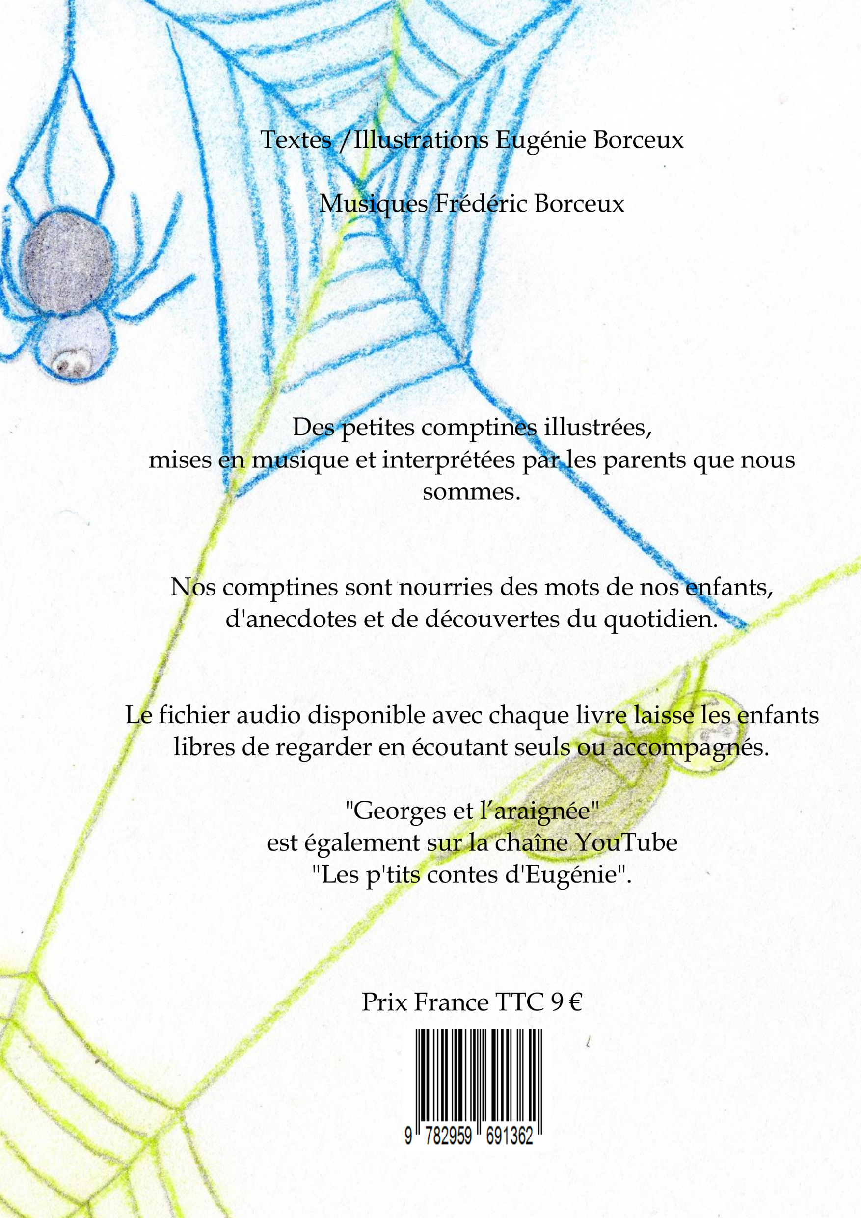 Des petites comptines illustrées, mises en musique et interprétées par les parents que nous sommes. Nos comptines sont nourries des mots de nos enfants, d'anecdotes et de découvertes du quotidien. Le fichier audio disponible avec chaque livre laisse les enfants libres de regarder en écoutant seuls ou accompagnés. Georges et l'araignée est également disponible sur la chaîne YouTube "Les p'tits contes d'Eugénie".