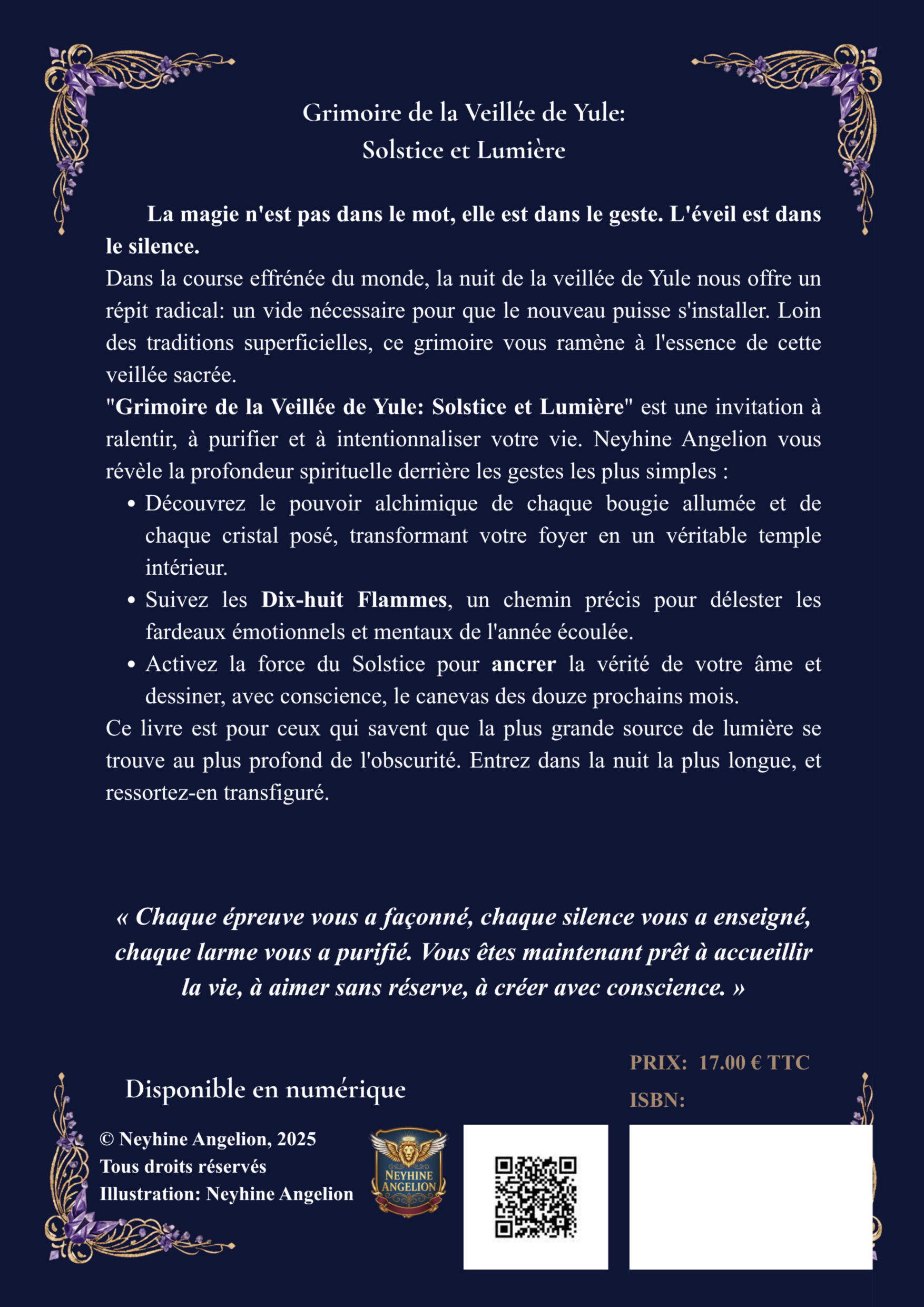 "Grimoire de la Veillée de Yule: Solstice et Lumière" est une invitation à ralentir, à purifier et à intentionnaliser votre vie. Neyhine Angelion vous révèle la profondeur spirituelle derrière les gestes les plus simples : Découvrez le pouvoir alchimique de chaque bougie allumée et de chaque cristal posé, transformant votre foyer