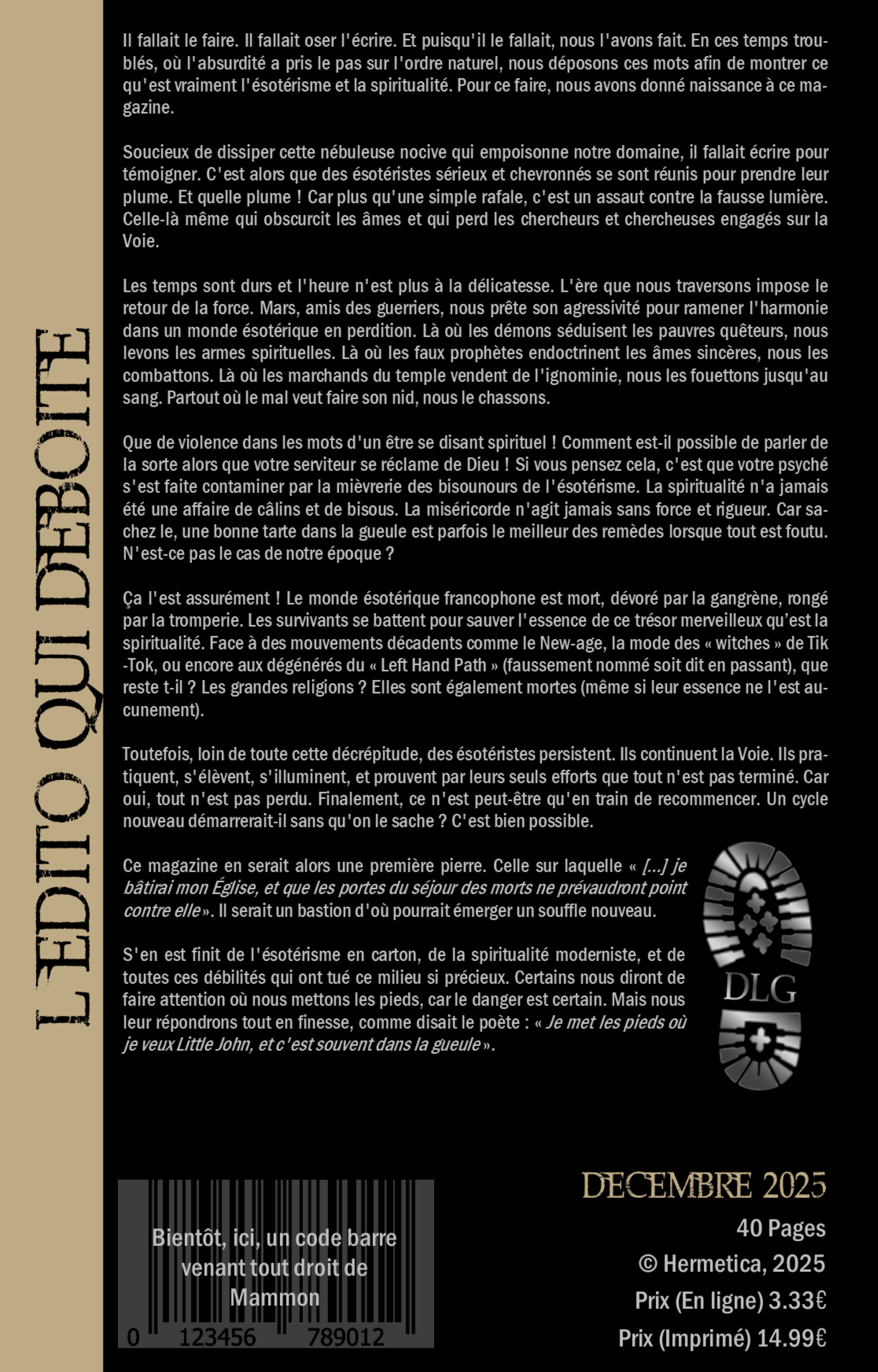 Hermetica, le nouveau magazine de l’ésotérisme français, débarque ! Plongez dans un univers fascinant où se mêlent mystique, ésotérisme et occultisme. Ce premier numéro secoue les codes avec des sujets tels que : la différence subtile entre instinct et intuition, les raisons du déclin des églises, un dossier exclusif sur la table énochienne de la Terre, ou encore les liens surprenants entre l’univers de Warhammer 40K et la Gnose. Découvrez aussi l’Astrum Argenteum, l’essor du spiritisme au XIXe siècle, la symbolique de l’androgyne primordial et l’analyse d’une lame de tarot. Des sujets pour tous les goûts, tous les intérêts ! Entre sérieux et provocation, Hermetica donne un coup de fouet à l’ésotérisme.