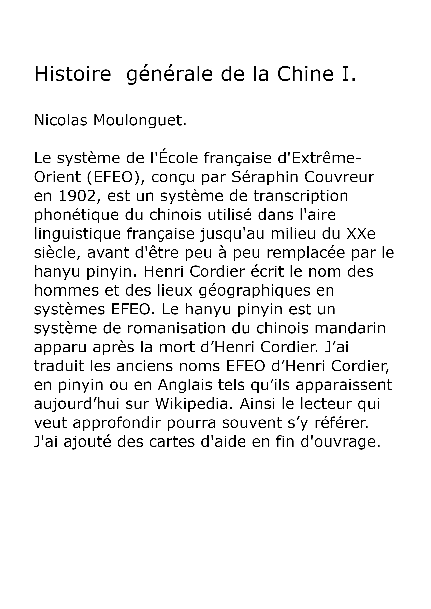 Le système de l'École française d'Extrême-Orient (EFEO), conçu par Séraphin Couvreur en 1902, est un système de transcription phonétique du chinois utilisé dans l'aire linguistique française jusqu'au milieu du XXe siècle, avant d'être peu à peu remplacée par le hanyu pinyin. Henri Cordier écrit le nom des hommes et des lieux géographiques en systèmes EFEO. Le hanyu pinyin est un système de romanisation du chinois mandarin apparu après la mort d’Henri Cordier. J’ai traduit les anciens noms EFEO d’Henri Cordier, en pinyin ou en Anglais tels qu’ils apparaissent aujourd’hui sur Wikipedia. Ainsi le lecteur qui veut approfondir pourra souvent s’y référer. J'ai ajouté des cartes d'aide en fin d'ouvrage.