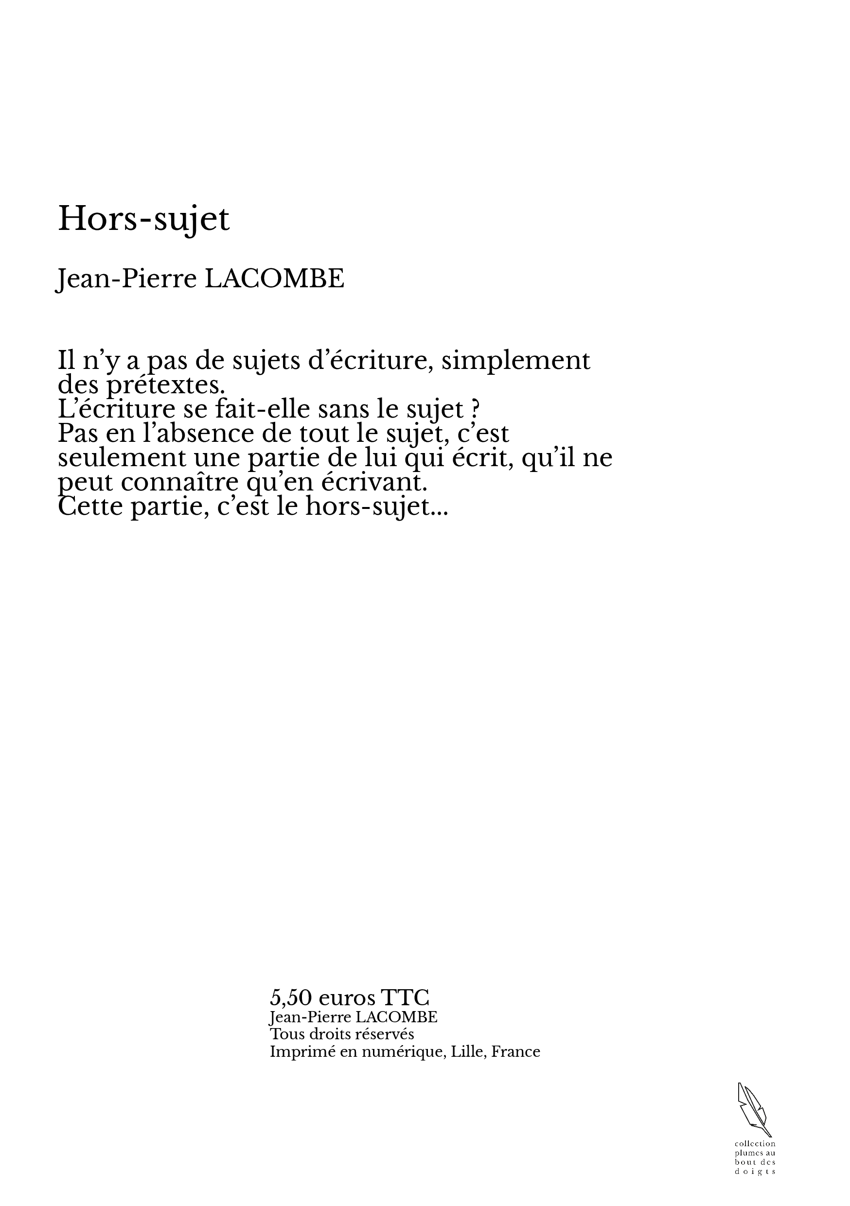 Il n’y a pas de sujets d’écriture, simplement des prétextes. L’écriture se fait-elle sans le sujet ? Pas en l’absence de tout le sujet, c’est seulement une partie de lui qui écrit, qu’il ne peut connaître qu’en écrivant. Cette partie, c’est le hors-sujet...