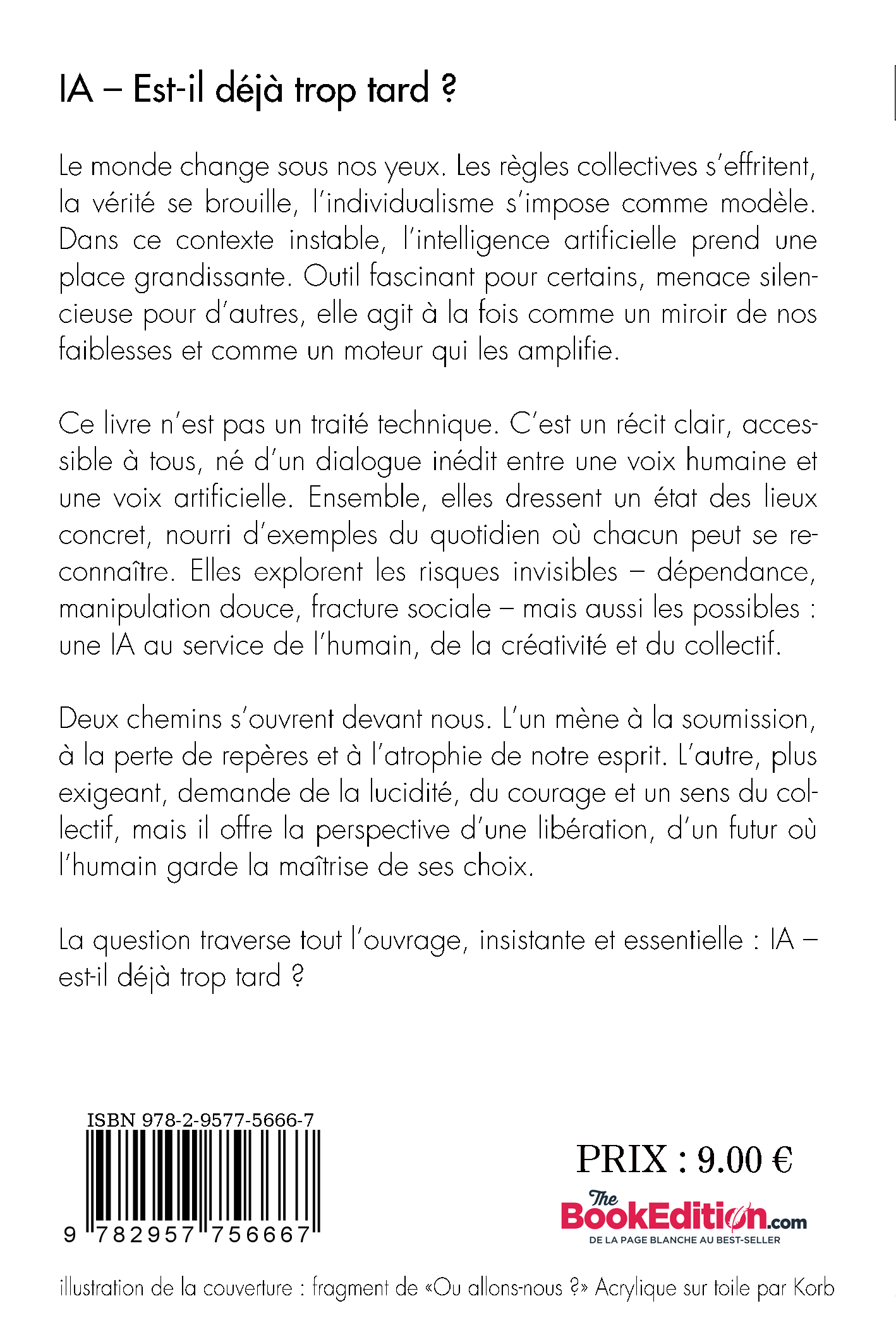 Le monde vacille : les règles communes s’effritent, la vérité se brouille, la dépendance s’installe. L’intelligence artificielle, loin d’être neutre, amplifie nos dérives tout en promettant des horizons infinis. Ce livre, rédigé en dialogue avec elle, dresse un état des lieux lucide, concret et accessible, nourri d’exemples où chacun peut se reconnaître. À travers ce miroir, il nous invite à réfléchir : voulons-nous laisser la machine décider pour nous ou garder la maîtrise de nos choix ? Deux chemins s’ouvrent : soumission ou libération. La question demeure, urgente et essentielle : IA – est-il déjà trop tard ?