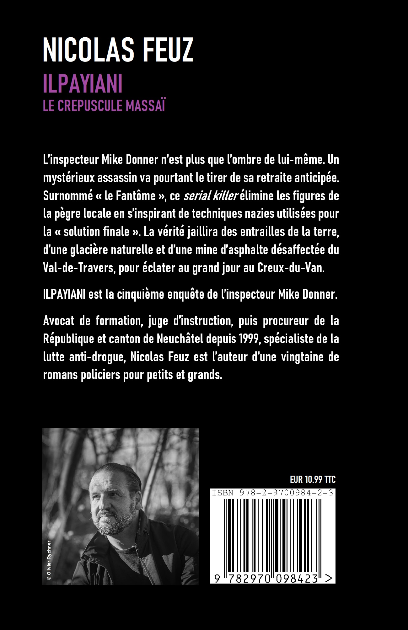 Dernier volet de la "trilogie massaï", ILPAYIANI, le crépuscule massaï, conclut les sombres aventures du jeune inspecteur de la brigade des stupéfiants Michaël Donner, déjà fort malmené par ses enquêtes kenyane (ILMORAN, l'avènement du guerrier) et balkanique (ILAYOK, le berceau de la folie). Dans cet ultime opus, un mystérieux serial killer baptisé "le Fantôme" s'en prend violemment à la pègre locale et vient défier Donner sur son propre territoire, sur fond de solution finale. Celle-ci jaillira des profondeurs de la terre neuchâteloise - des neiges éternelles d'une glacière naturelle et d'une mine d'asphalte désaffectée du Val-de-Travers - pour éclater au jour levant sur les falaises à pic du Creux-du-Van.