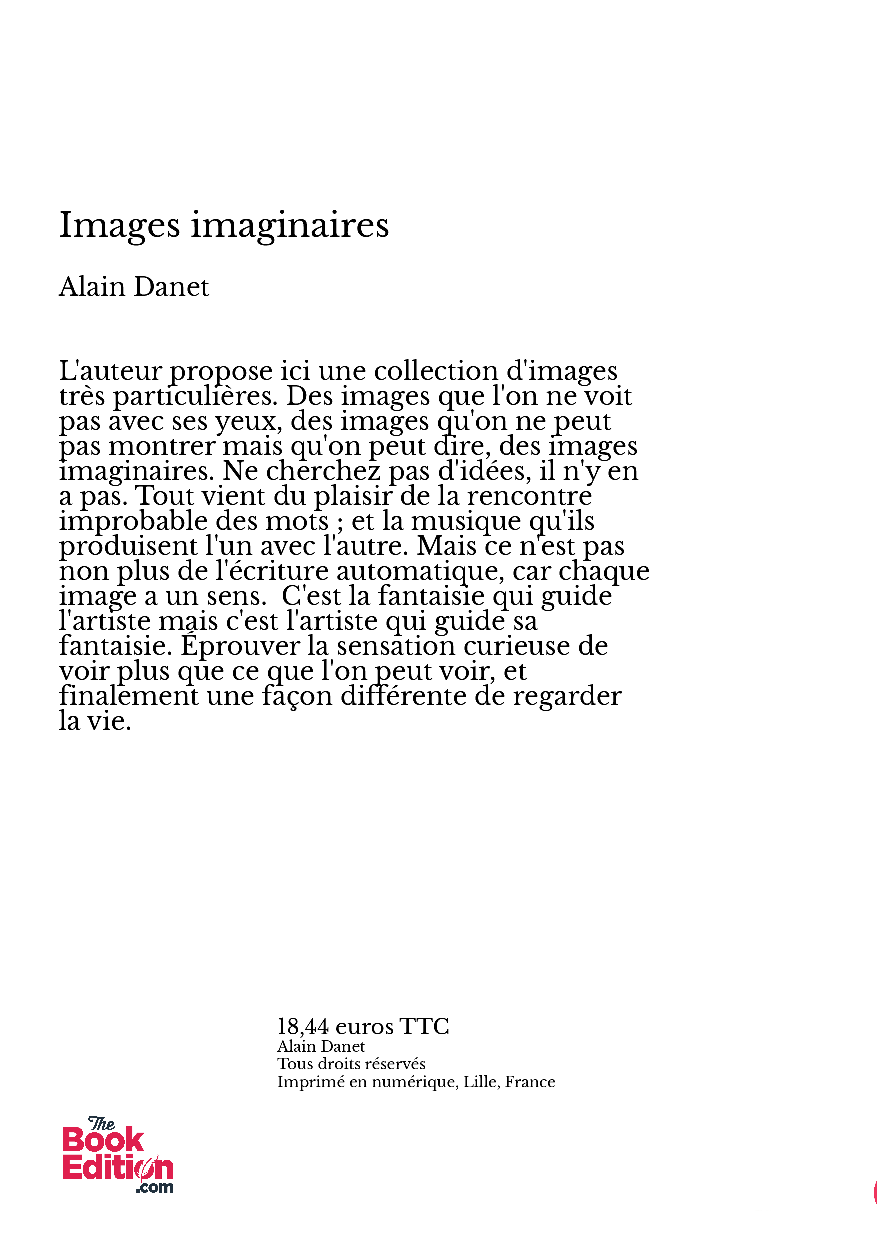 L'auteur propose ici une collection d'images très particulières. Des images que l'on ne voit pas avec ses yeux, des images qu'on ne peut pas montrer mais qu'on peut dire, des images imaginaires. Ne cherchez pas d'idées, il n'y en a pas. Tout vient du plaisir de la rencontre improbable des mots ; et la musique qu'ils produisent l'un avec l'autre. Mais ce n'est pas non plus de l'écriture automatique, car chaque image a un sens. C'est la fantaisie qui guide l'artiste mais c'est l'artiste qui guide sa fantaisie. Éprouver la sensation curieuse de voir plus que ce que l'on peut voir, et finalement une façon différente de regarder la vie.
