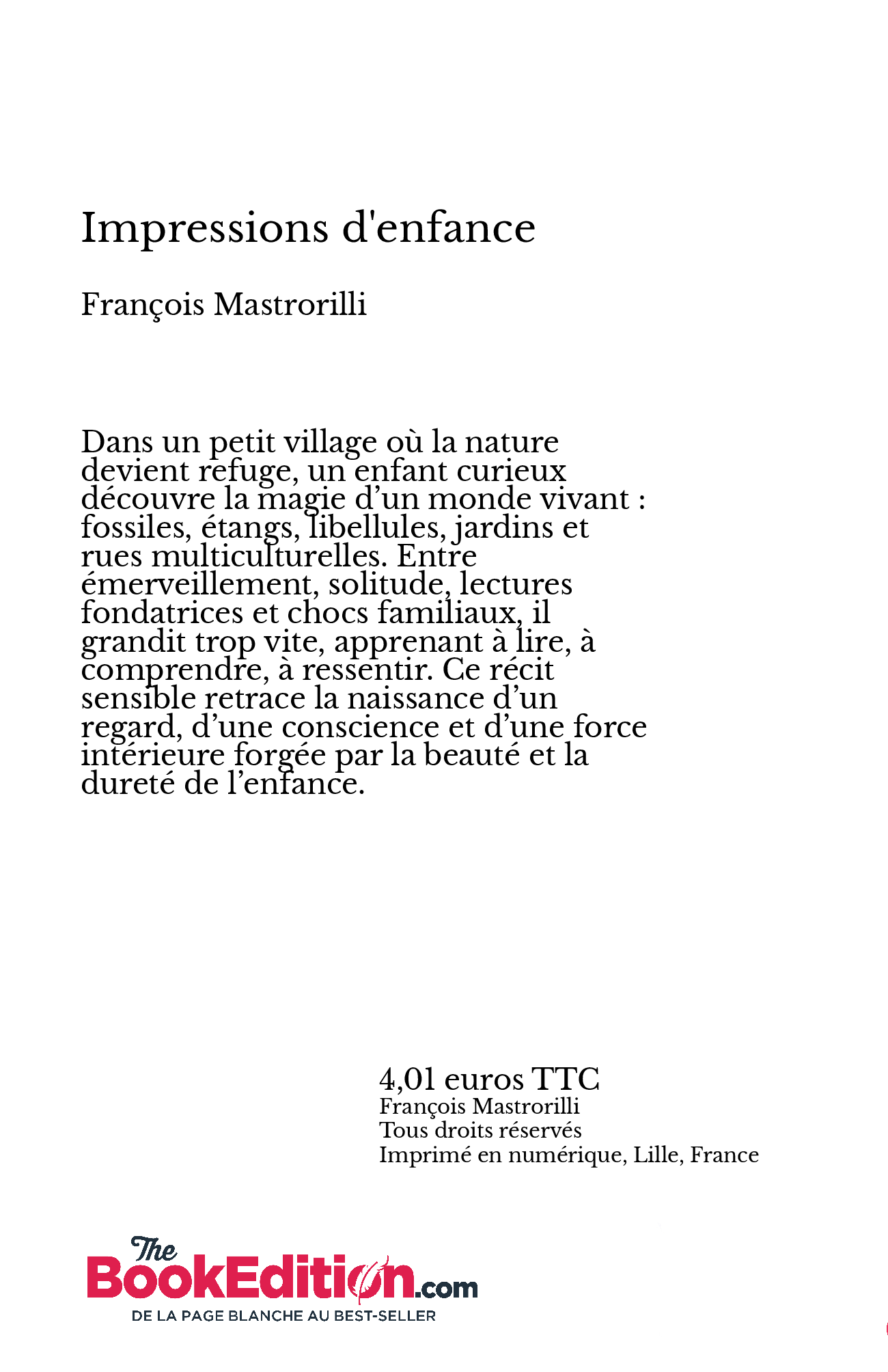 Dans un petit village où la nature devient refuge, un enfant curieux découvre la magie d’un monde vivant : fossiles, étangs, libellules, jardins et rues multiculturelles. Entre émerveillement, solitude, lectures fondatrices et chocs familiaux, il grandit trop vite, apprenant à lire, à comprendre, à ressentir. Ce récit sensible retrace la naissance d’un regard, d’une conscience et d’une force intérieure forgée par la beauté et la dureté de l’enfance.