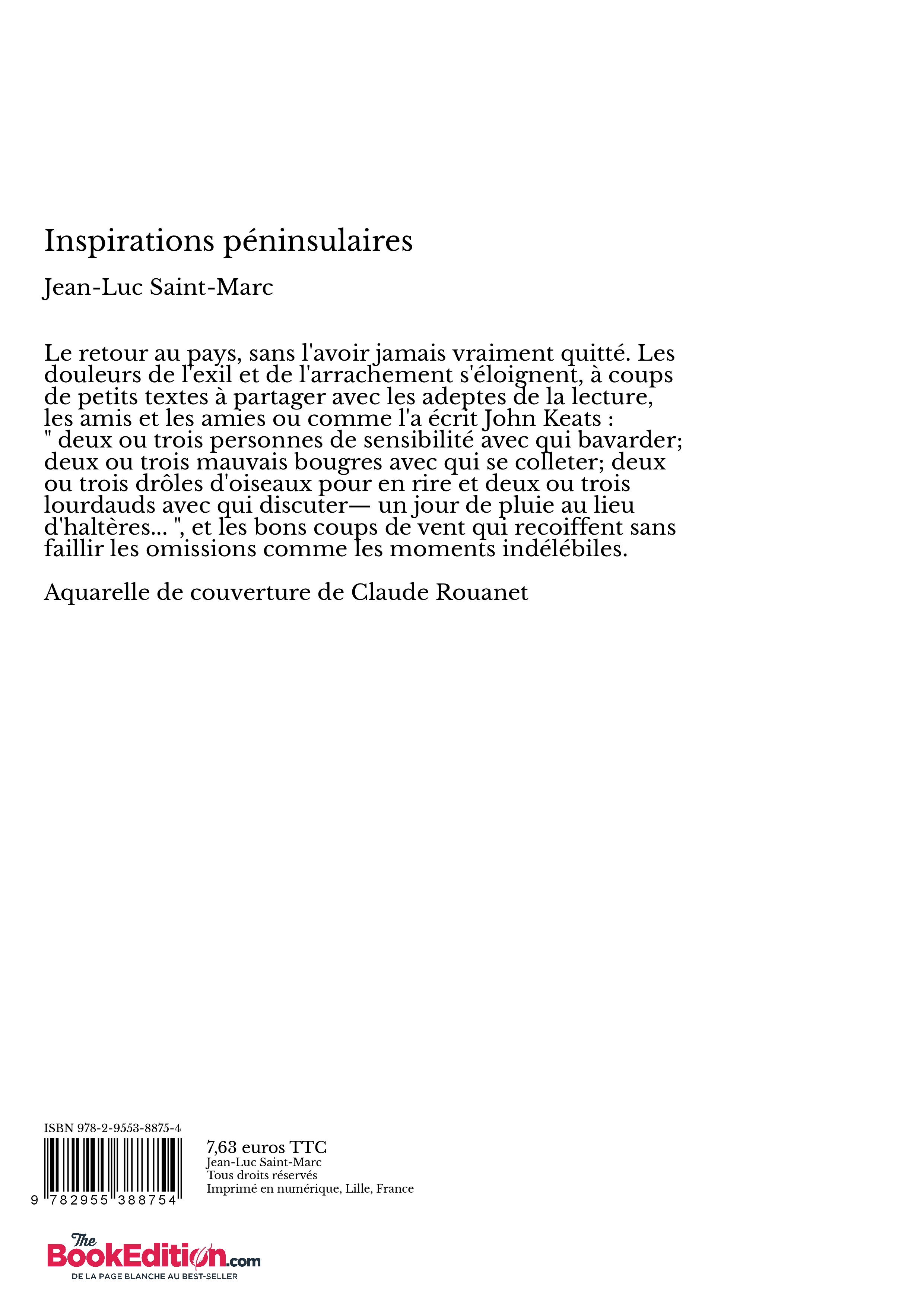 Le retour au pays, sans l'avoir jamais vraiment quitté. Les douleurs de l'exil et de l'arrachement s'éloignent, à coups de petits textes à partager avec les adeptes de la lecture, les amis et les amies ou comme l'a écrit John Keats : " deux ou trois personnes de sensibilité avec qui bavarder; deux ou trois mauvais bougres avec qui se colleter; deux ou trois drôles d'oiseaux pour en rire et deux ou trois lourdauds avec qui discuter— un jour de pluie au lieu d'haltères... ", et les bons coups de vent qui recoiffent sans faillir les omissions comme les moments indélébiles.