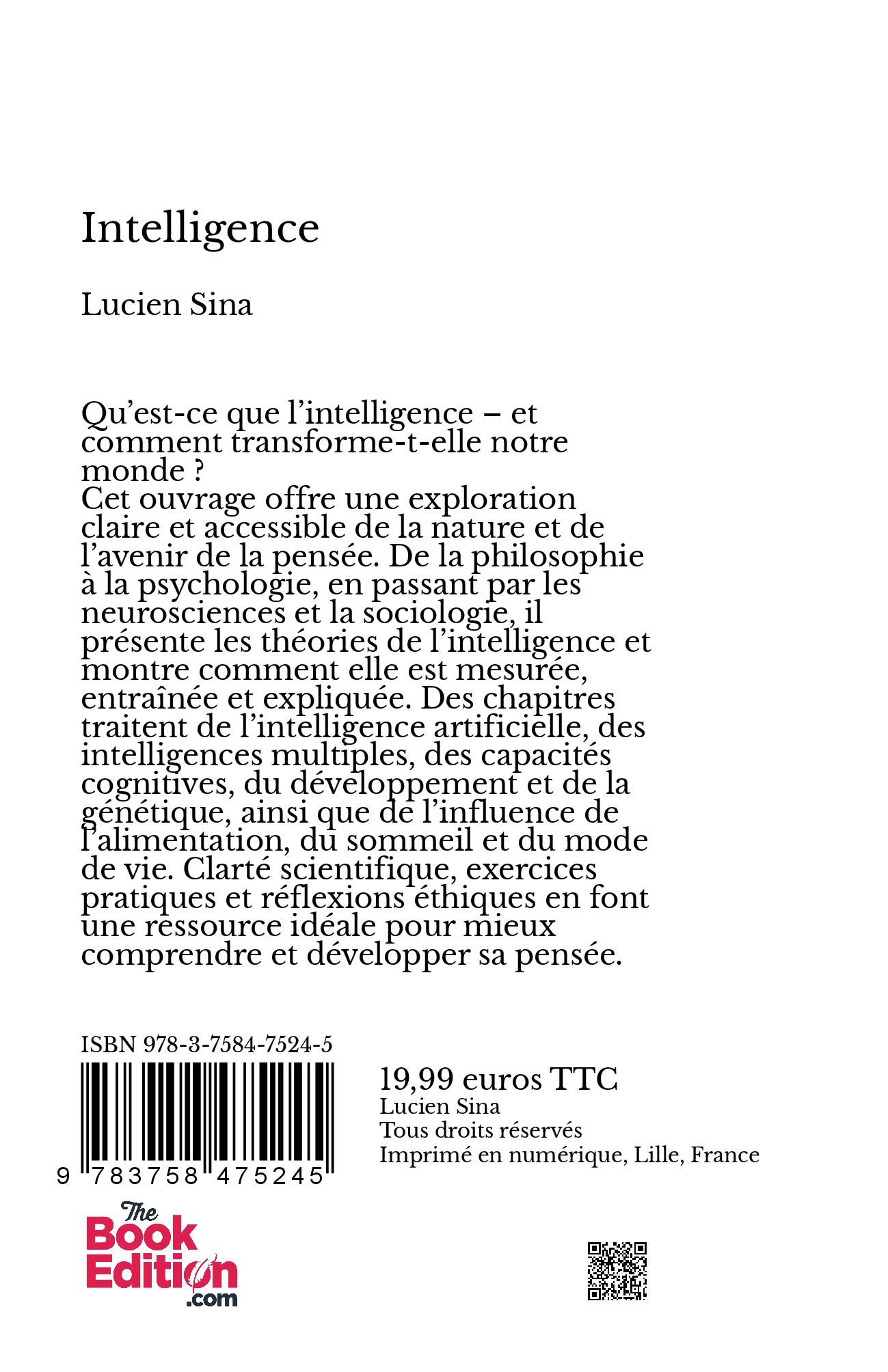Cet ouvrage offre une exploration claire et accessible de la nature et de l’avenir de la pensée. De la philosophie à la psychologie, en passant par les neurosciences et la sociologie, il présente les théories de l’intelligence et montre comment elle est mesurée, entraînée et expliquée. Des chapitres traitent de l’intelligence artificielle, des intelligences multiples, des capacités cognitives, du développement et de la génétique, ainsi que de l’influence de l’alimentation, du sommeil et du mode de vie. Clarté scientifique, exercices pratiques et réflexions éthiques en font une ressource idéale pour mieux comprendre et développer sa pensée.