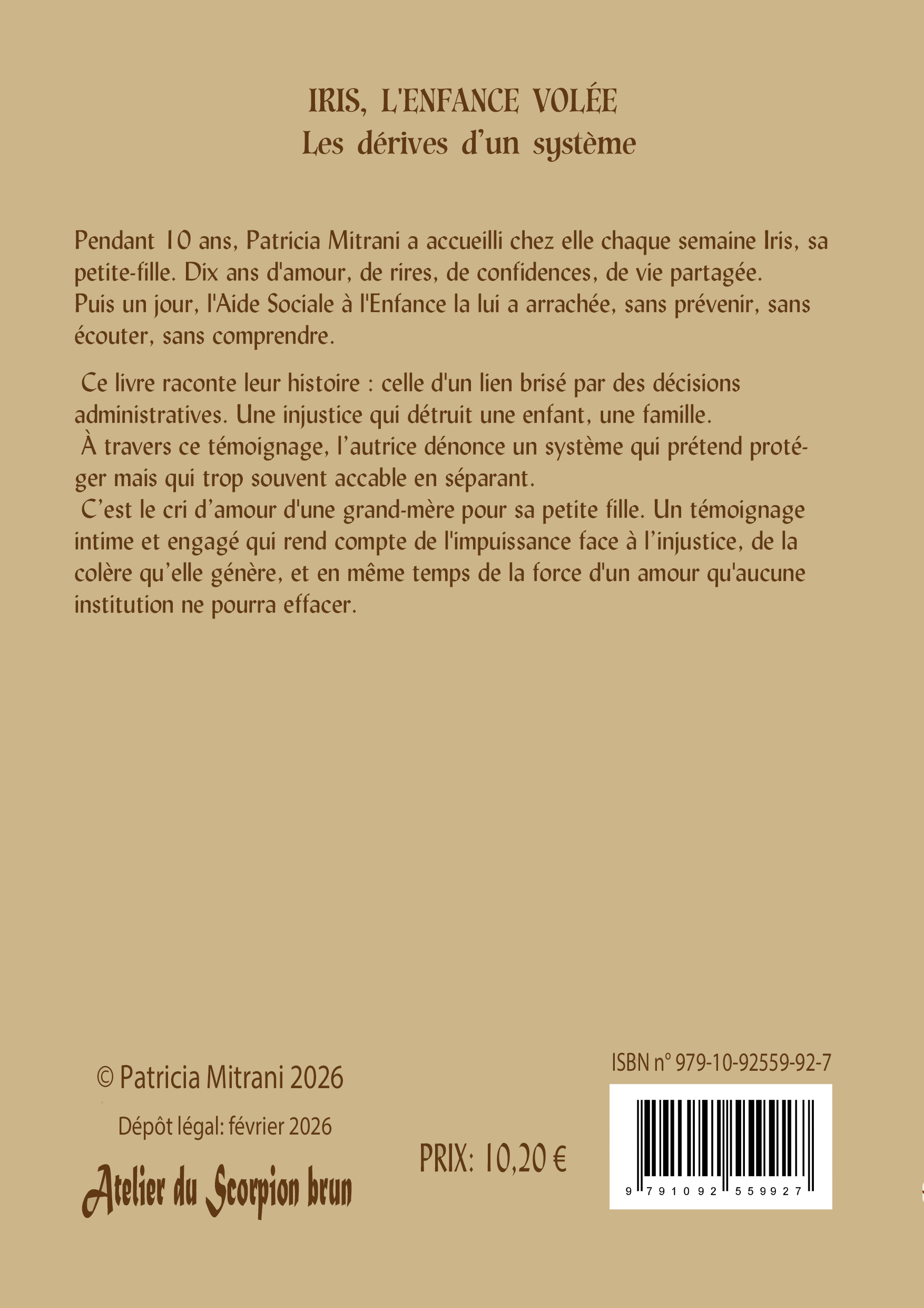 Pendant I0 ans, Patricia Mitrani a accueilli chez elle chaque semaine Iris, sa petite-fille. Dix ans d'amour, de rires, de confidences, de vie partagée. Puis un jour, l'Aide Sociale à l'Enfance la lui a arrachée sans accepter de l'entendre.