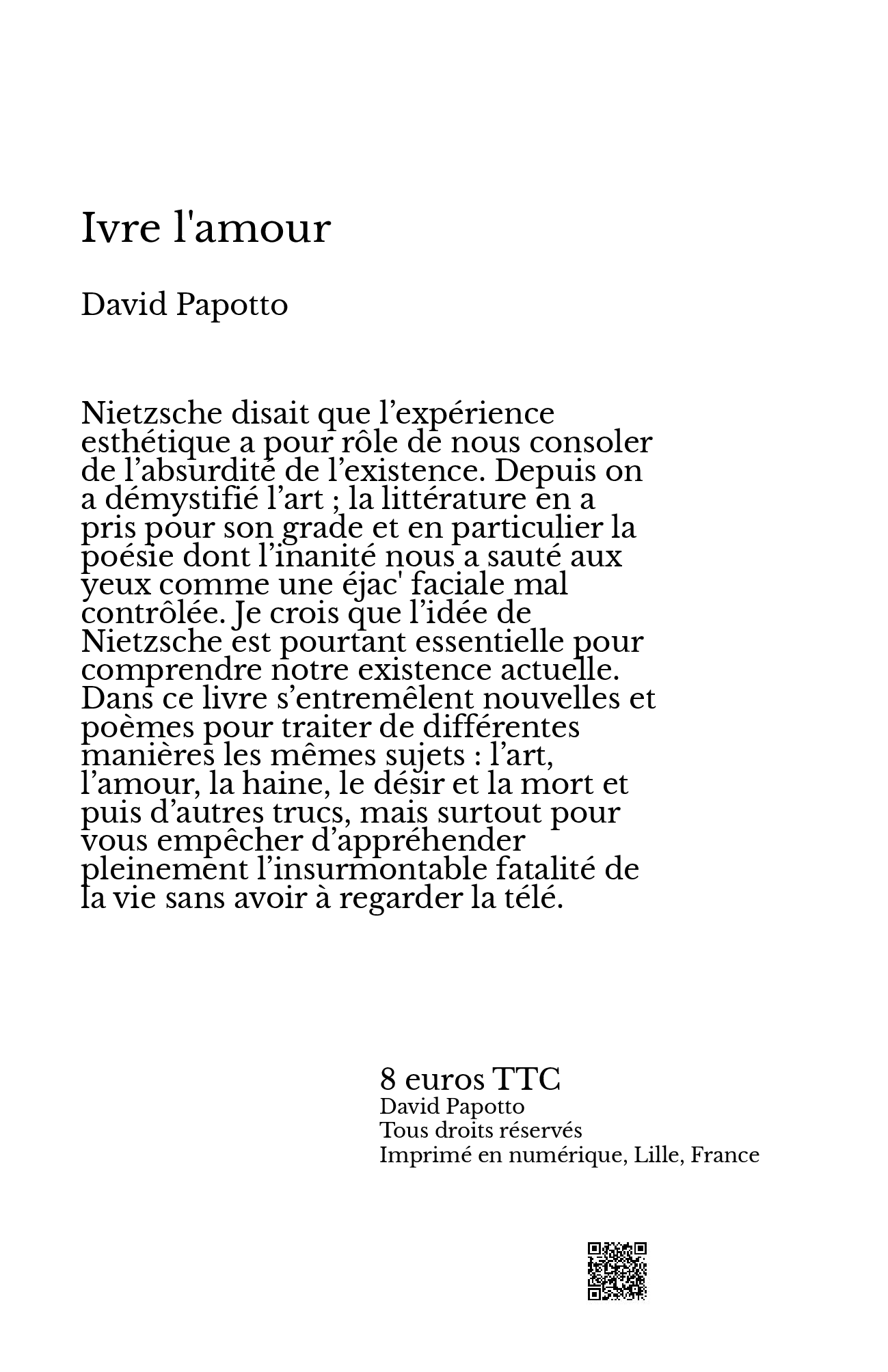 Dans ce livre s’entremêlent nouvelles et poèmes pour traiter de différentes manières les mêmes sujets : l’art, l’amour, la haine, le désir et la mort et puis d’autres trucs, mais surtout pour vous empêcher d’appréhender pleinement l’insurmontable fatalité de la vie sans avoir à regarder la télé.