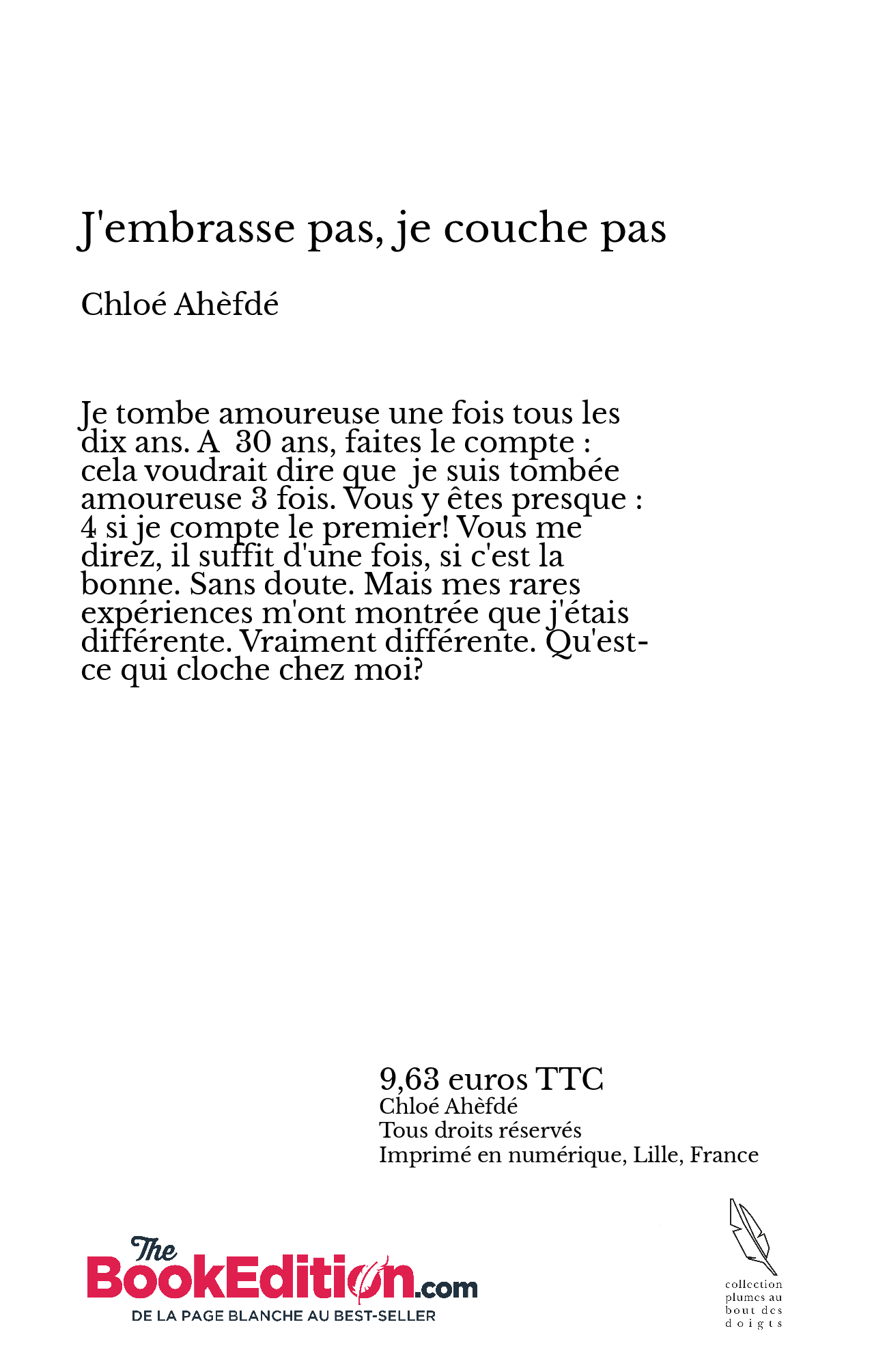 Je tombe amoureuse une fois tous les dix ans. A 30 ans, faites le compte : cela voudrait dire que je suis tombée amoureuse 3 fois. Vous y êtes presque : 4 si je compte le premier! Vous me direz, il suffit d'une fois, si c'est la bonne. Sans doute. Mais mes rares expériences m'ont montrée que j'étais différente. Vraiment différente. Qu'est-ce qui cloche chez moi?