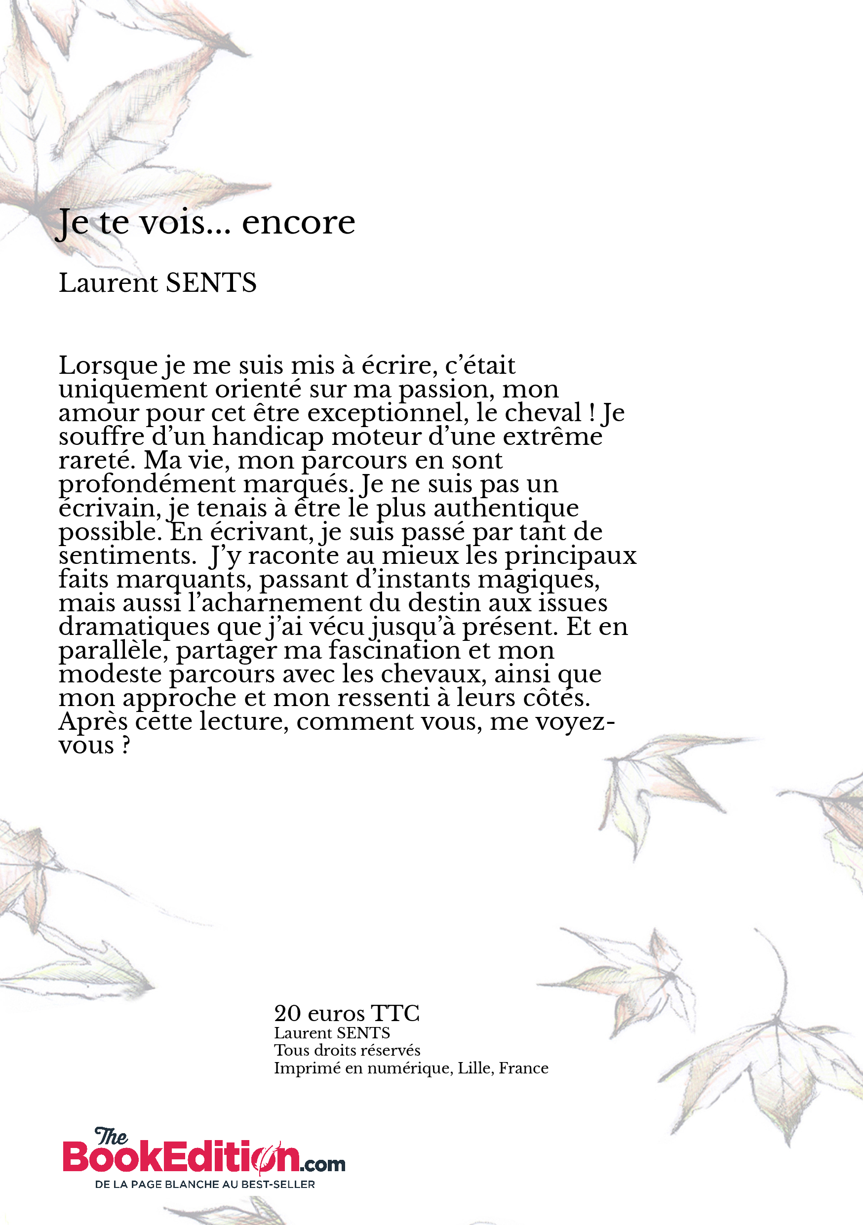 Lorsque je me suis mis à écrire, c’était uniquement orienté sur ma passion, mon amour pour cet être exceptionnel, le cheval ! Je souffre d’un handicap moteur d’une extrême rareté. Ma vie, mon parcours en sont profondément marqués. Je ne suis pas un écrivain, je tenais à être le plus authentique possible. En écrivant, je suis passé par tant de sentiments. J’y raconte au mieux les principaux faits marquants, passant d’instants magiques, mais aussi l’acharnement du destin aux issues dramatiques que j’ai vécu jusqu’à présent. Et en parallèle, partager ma fascination et mon modeste parcours avec les chevaux, ainsi que mon approche et mon ressenti à leurs côtés. Après cette lecture, comment vous, me voyez-vous ?