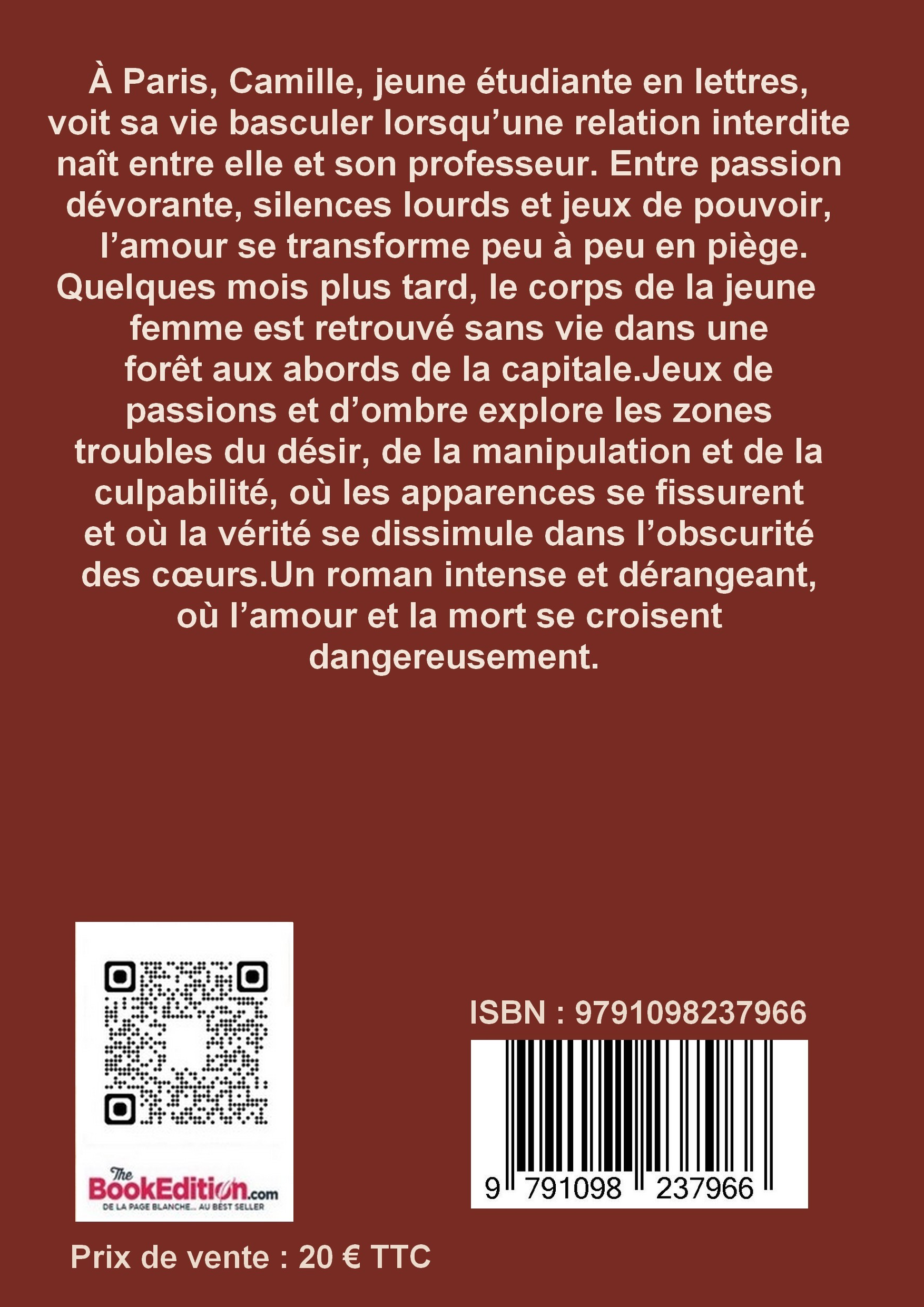 Le professeur Tristan croyait que ses sentiments pour Camille, brillante et fragile, pouvaient rester inoffensifs. Il croyait pouvoir protéger celle qu’il aimait sans jamais franchir la ligne. Mais Anaïs, sa collègue de 34 ans, intelligente, déterminée, et mystérieusement proche de ses propres ambitions, change la donne. Entre manipulation et séduction, Tristan se perd dans ses émotions, incapable de distinguer désir sincère et piège calculé. Camille est-elle celle qu’il doit protéger, ou Anaïs celle qui pourrait le guider vers sa chute ? Les apparences sont trompeuses, les intentions opaques. Ouvrez ces pages avec prudence : vous êtes sur le point de marcher dans un labyrinthe où le désir et la trahison se confondent...