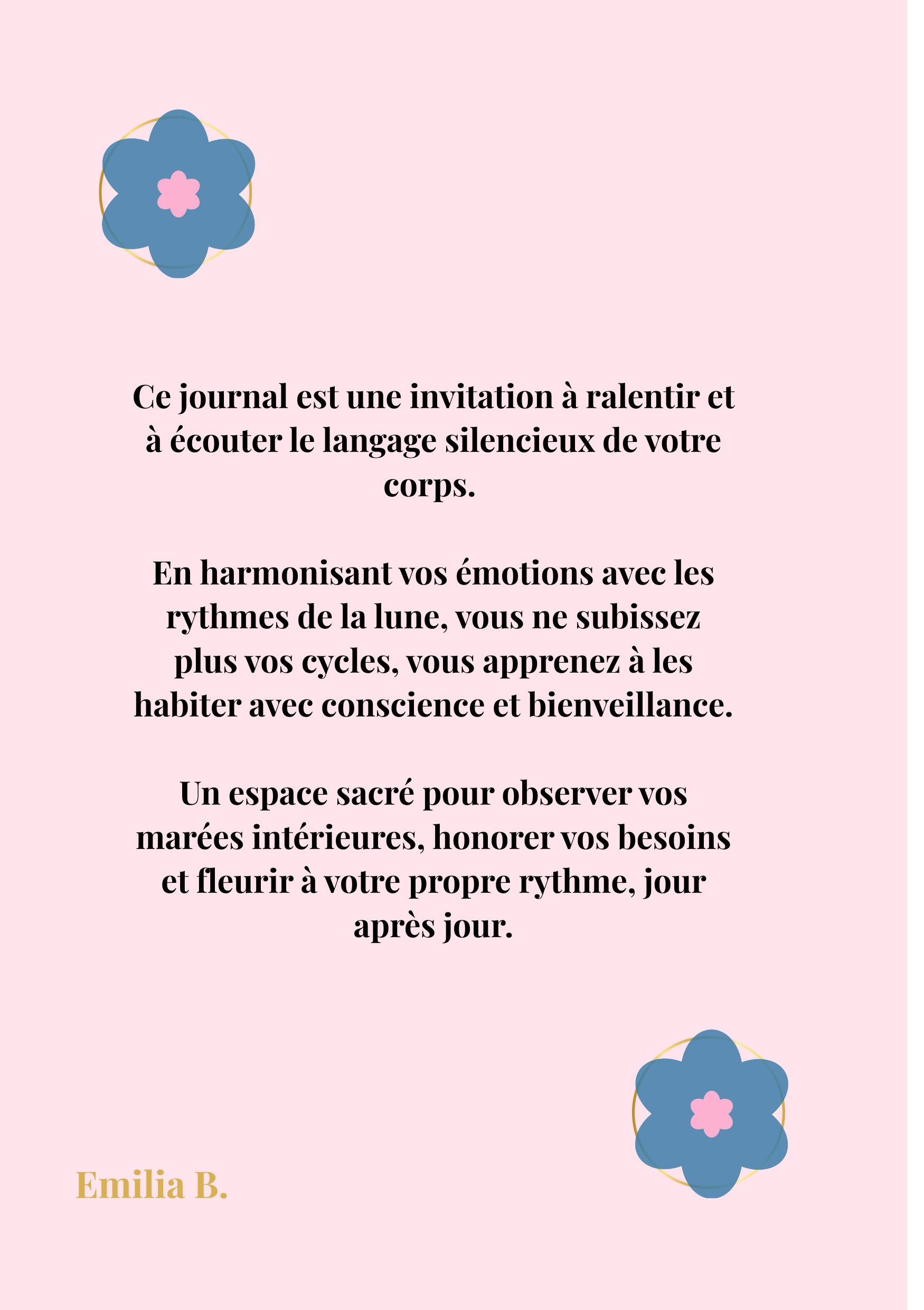 Ce journal est conçu pour vous reconnecter à votre corps. Sur 30 jours, documentez précisément votre cycle menstruel : de la phase folliculaire à la phase lutéale.