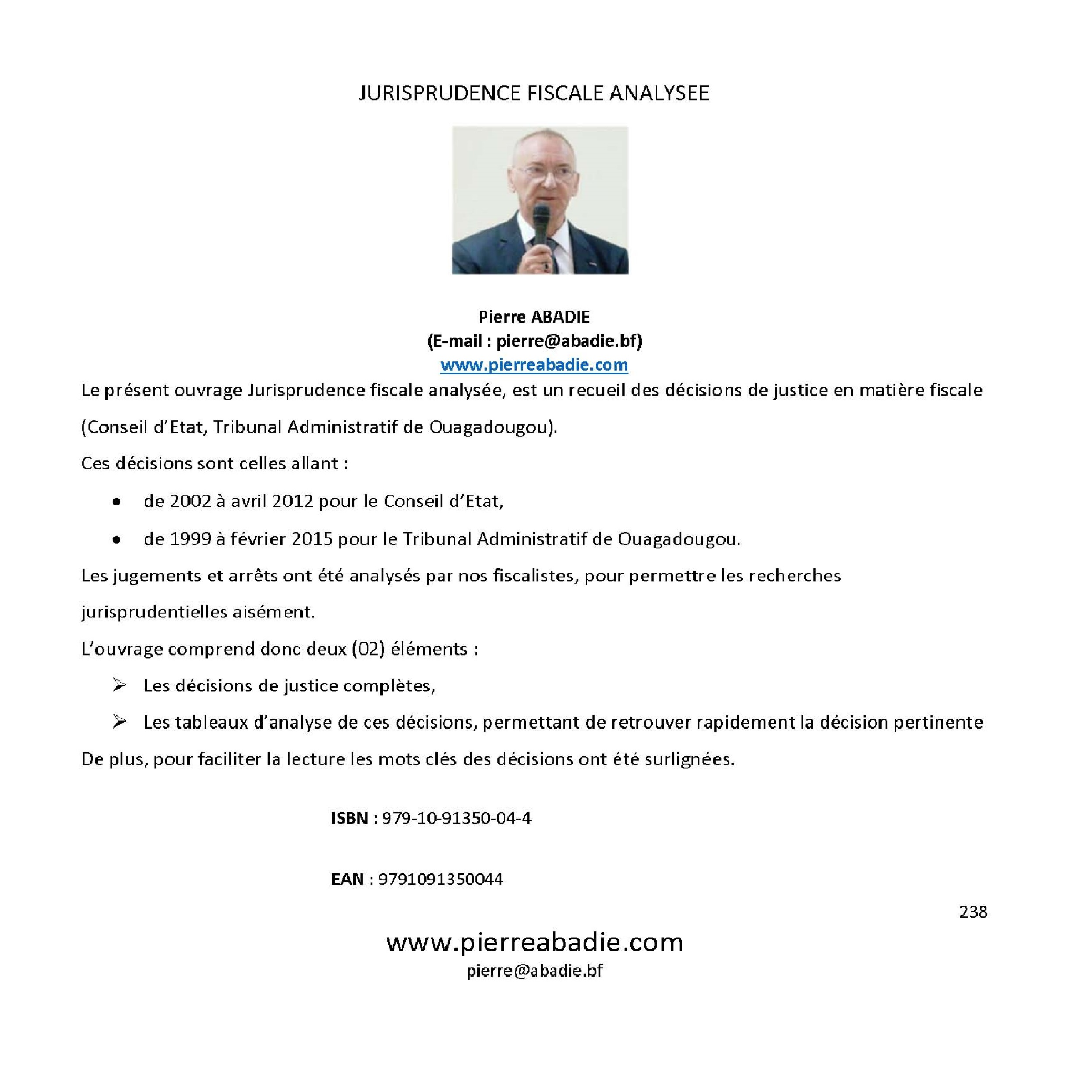 Le présent ouvrage Jurisprudence fiscale analysée, est un recueil des décisions de justice en matière fiscale (Conseil d’Etat, Tribunal Administratif de Ouagadougou).