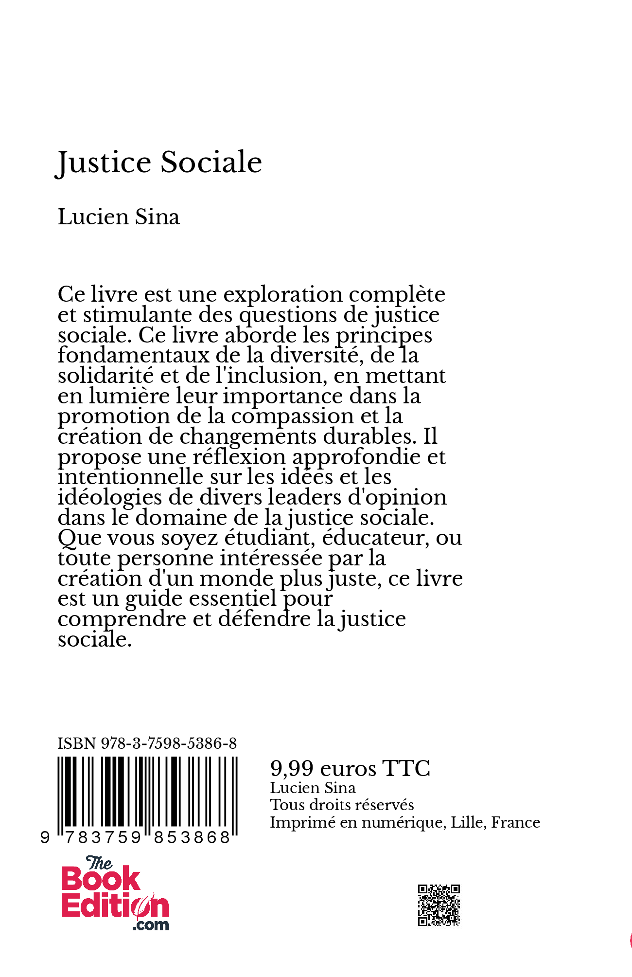 Ce livre est une exploration complète et stimulante des questions de justice sociale. Ce livre aborde les principes fondamentaux de la diversité, de la solidarité et de l'inclusion, en mettant en lumière leur importance dans la promotion de la compassion et la création de changements durables. Il propose une réflexion approfondie et intentionnelle sur les idées et les idéologies de divers leaders d'opinion dans le domaine de la justice sociale. Que vous soyez étudiant, éducateur ou toute personne intéressée par la création d'un monde plus juste, ce livre est un guide essentiel pour comprendre et défendre la justice sociale.