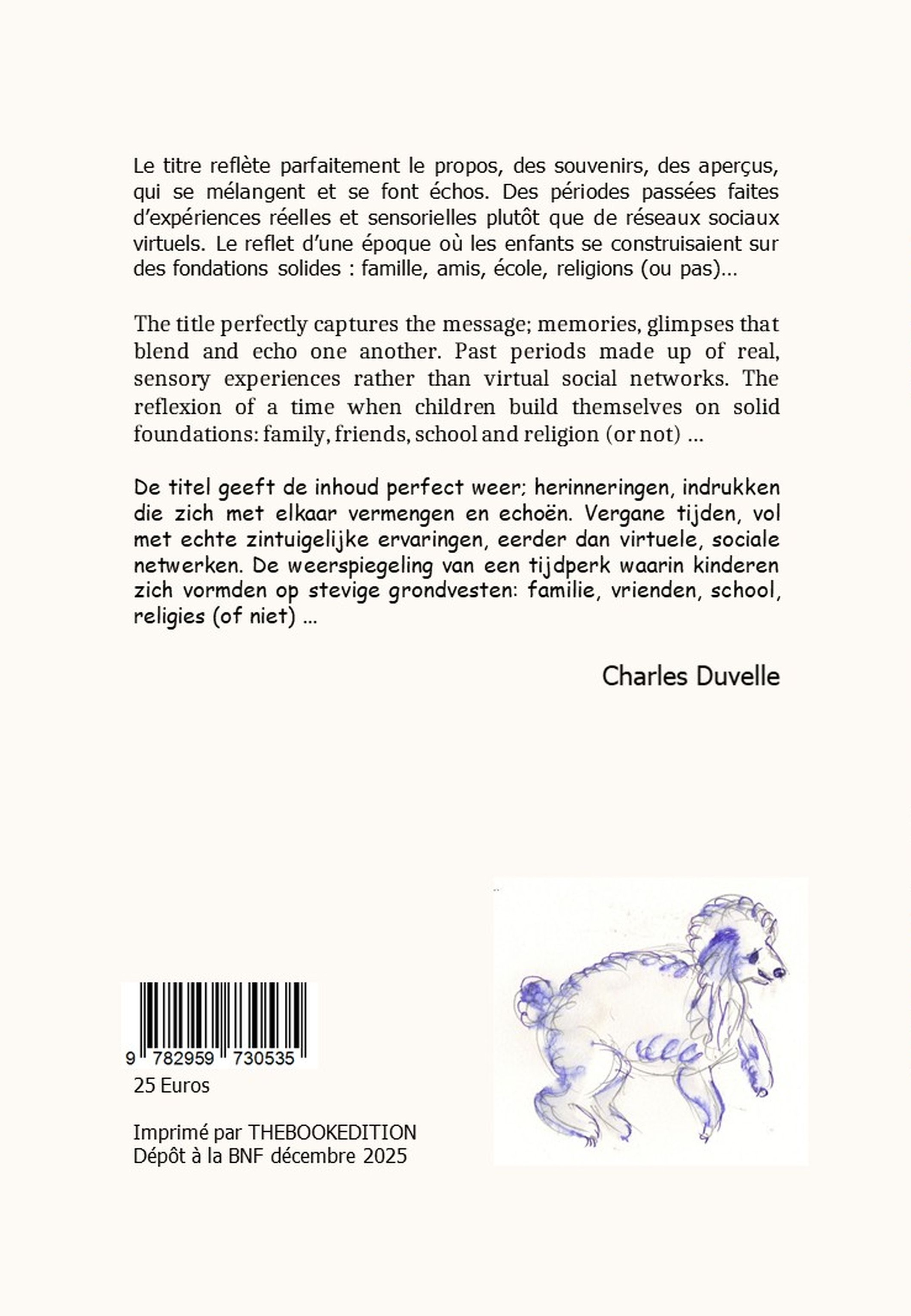 Elle parle en Anglais, vous la reconnaitrez à la couleur bleue, chaque fois les traductions en français et en néerlandais viennent à la suite, quelques traductions en sanskrit. Tantôt Catherine, couleur rose, tantôt Nicoline, couleur verte lui répondent chacune dans sa langue par petites touches, des souvenirs, des aperçus, qui se mélangent et se font échos. Des périodes passées faites d’expériences réelles et sensorielles plutôt que de réseaux sociaux virtuels. Le reflet d’une époque où les enfants se construisaient sur des fondations solides : famille, amis, école, religions (ou pas)…