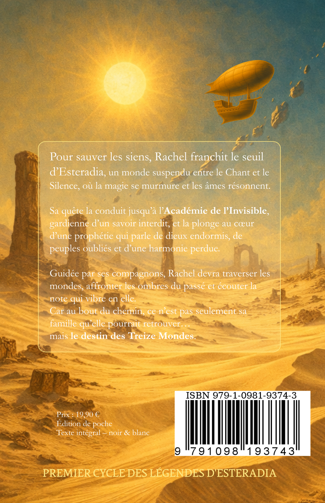 Pour sauver les siens, Rachel franchit le seuil d’Esteradia, un monde de fantasy suspendu entre le Chant et le Silence, où la magie se murmure et les âmes résonnent. Sa quête la conduit jusqu’à l’Académie de l’Invisible, gardienne d’un savoir interdit, et la plonge au cœur d’une prophétie oubliée qui parle de dieux endormis, de peuples effacés et d’une harmonie perdue. Guidée par ses compagnons, Rachel devra traverser les mondes, affronter les ombres du passé et écouter la note qui vibre en elle. Car au bout du chemin, ce n’est pas seulement sa famille qu’elle pourrait retrouver… mais le destin des Treize Mondes. Un roman de fantasy poétique et initiatique, où la magie devient musique et le destin, résonance.