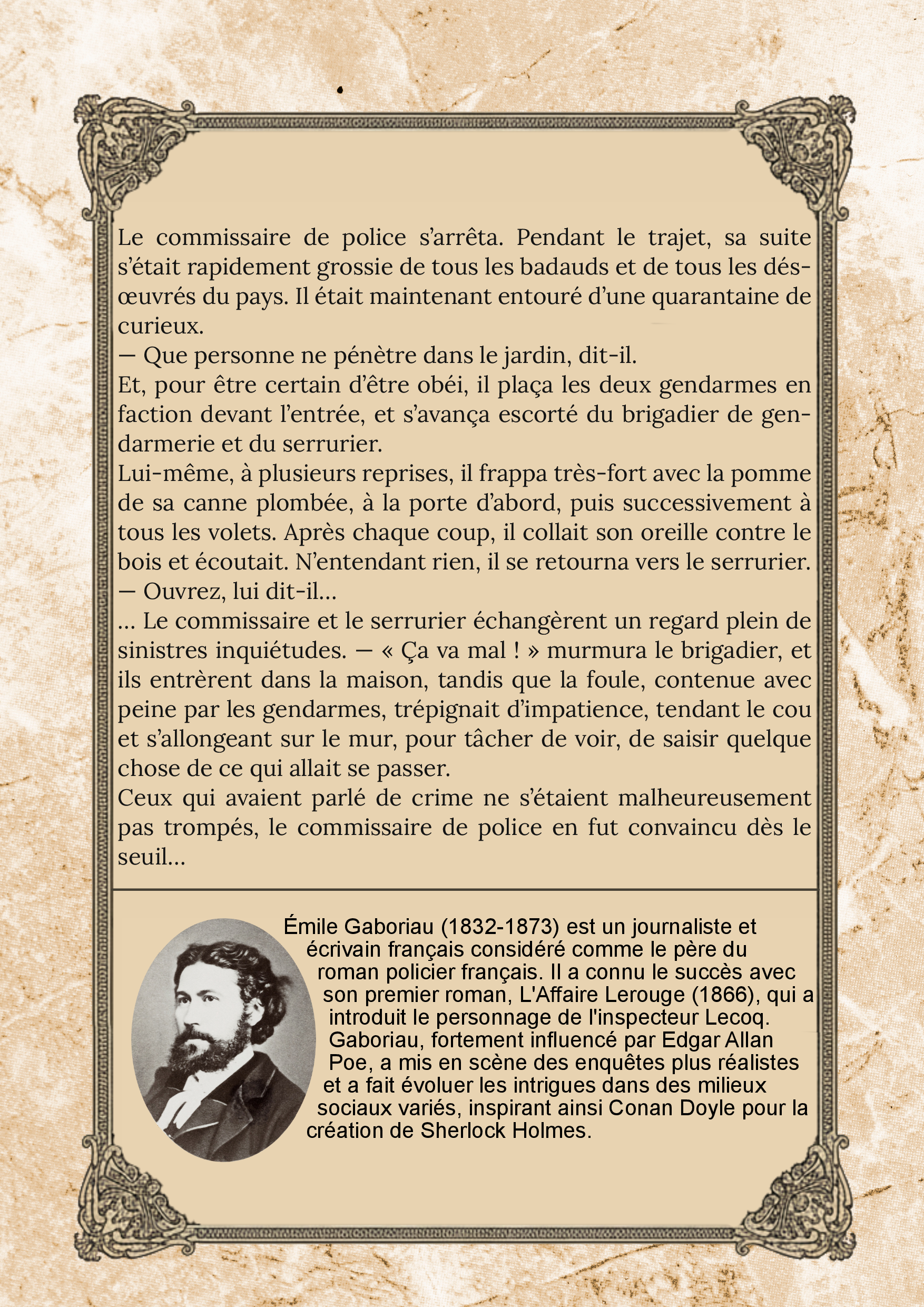 Il plaça deux gendarmes en faction devant l’entrée, et s’avança escorté du brigadier de gendarmerie et du serrurier.