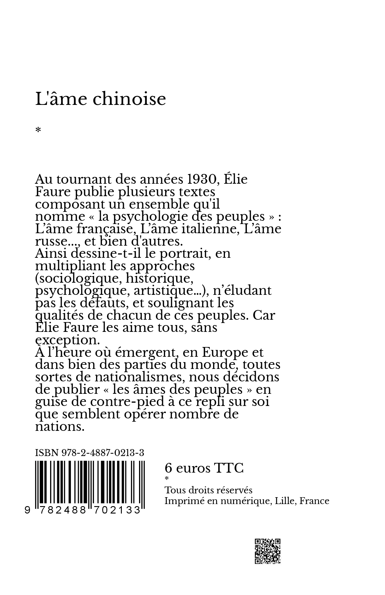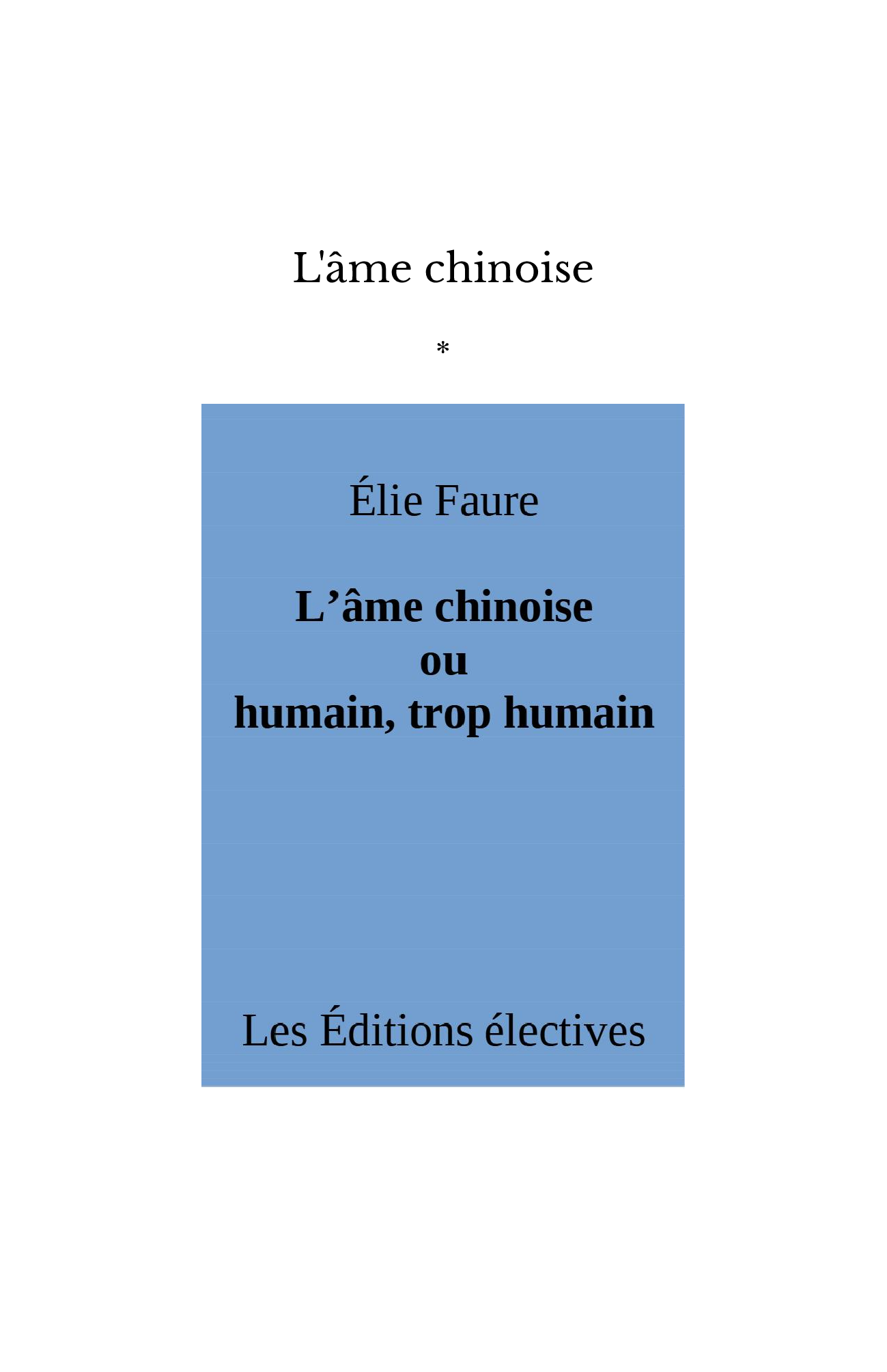 Au tournant des années 1930, Élie Faure publie plusieurs textes composant un ensemble qu'il nomme « la psychologie des peuples » : L’âme française, L’âme italienne, L’âme russe..., et bien d'autres.