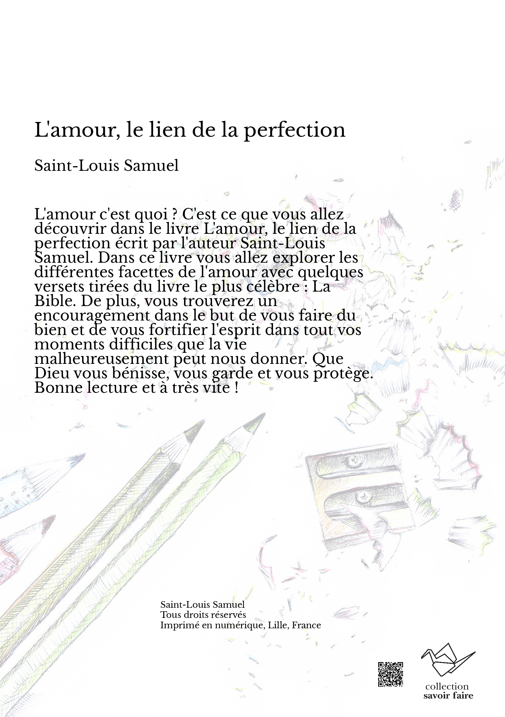Samuel Saint-Louis est un auteur d'origine martiniquaise âgé de 18 ans. Il démarre avec le premier ouvrage : L'amour, le lien de la perfection. Dans ce livre, il parle particulièrement de l'amour selon la Bible et avec des réflexions personnelles. Il fini avec un petit encouragement dans le but de fortifier toutes les personnes qui traversent une période difficile avec tout ce qui peut se passer dans le monde.