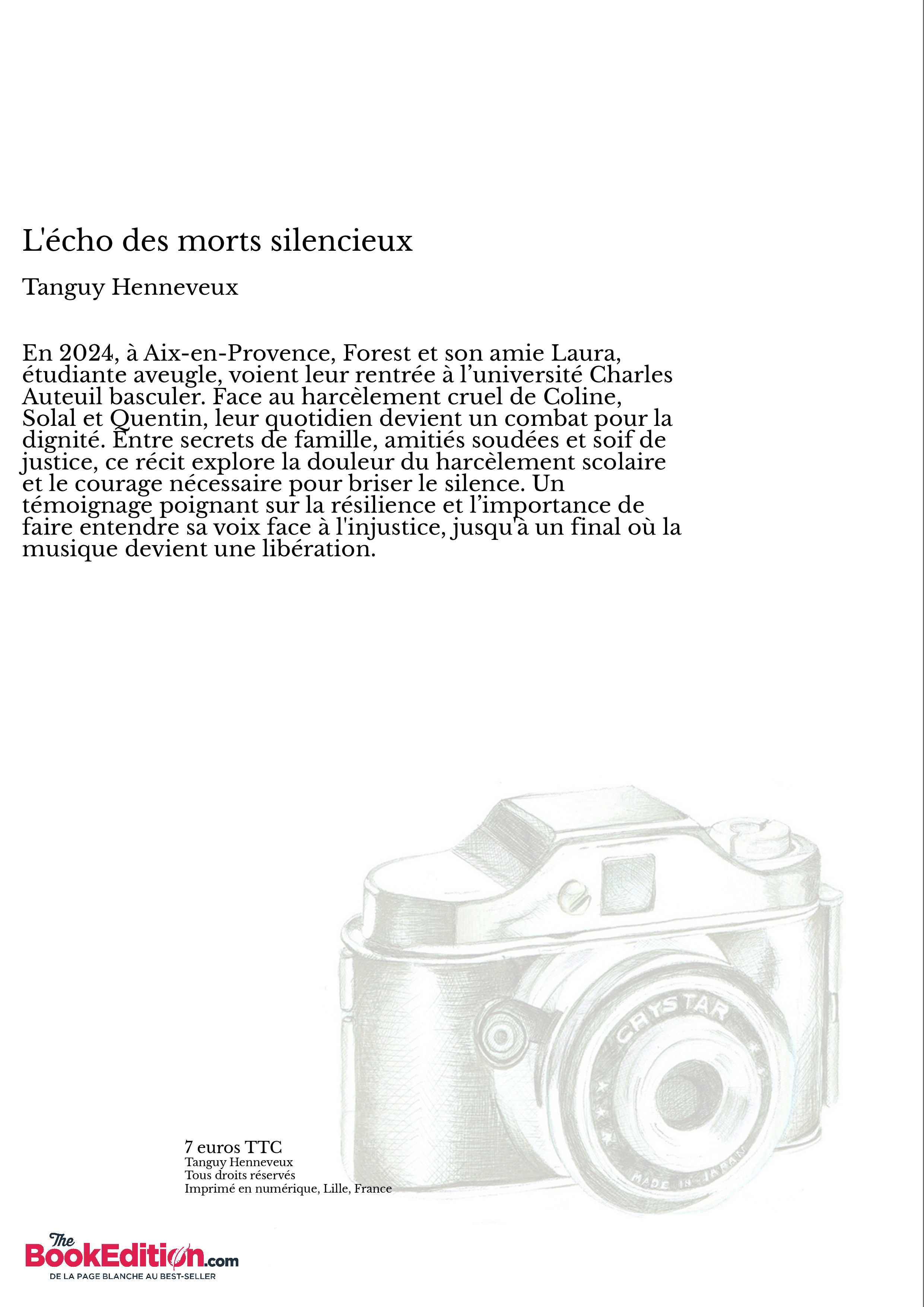En 2024, à Aix-en-Provence, Forest et son amie Laura, étudiante aveugle, voient leur rentrée à l’université Charles Auteuil basculer. Face au harcèlement cruel de Coline, Solal et Quentin, leur quotidien devient un combat pour la dignité. Entre secrets de famille, amitiés soudées et soif de justice, ce récit explore la douleur du harcèlement scolaire et le courage nécessaire pour briser le silence. Un témoignage poignant sur la résilience et l’importance de faire entendre sa voix face à l'injustice, jusqu'à un final où la musique devient une libération.
