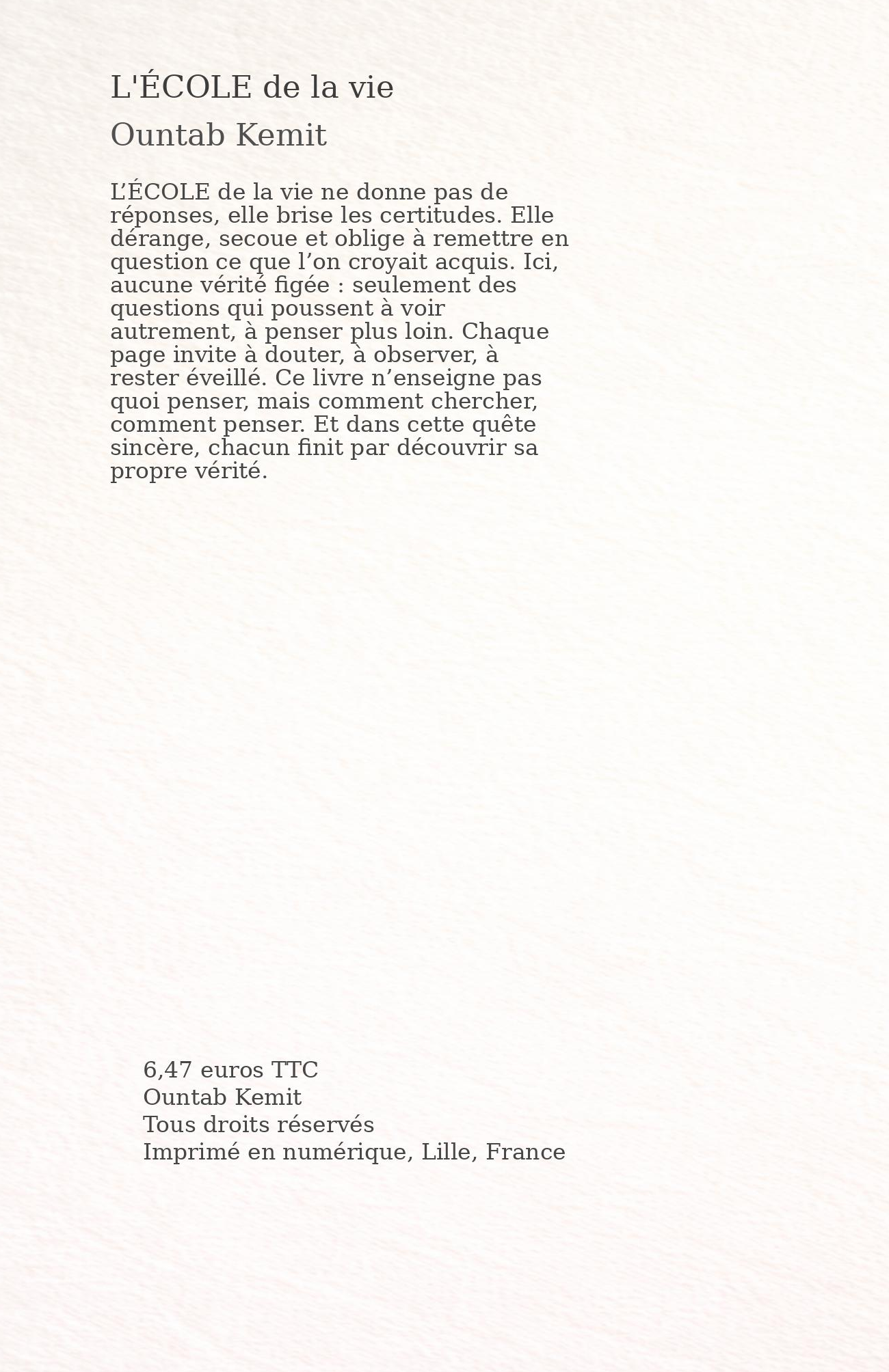 L’ÉCOLE de la vie ne donne pas de réponses, elle brise les certitudes. Elle dérange, secoue et oblige à remettre en question ce que l’on croyait acquis. Ici, aucune vérité figée : seulement des questions qui poussent à voir autrement, à penser plus loin. Chaque page invite à douter, à observer, à rester éveillé. Ce livre n’enseigne pas quoi penser, mais comment chercher, comment penser. Et dans cette quête sincère, chacun finit par découvrir sa propre vérité.