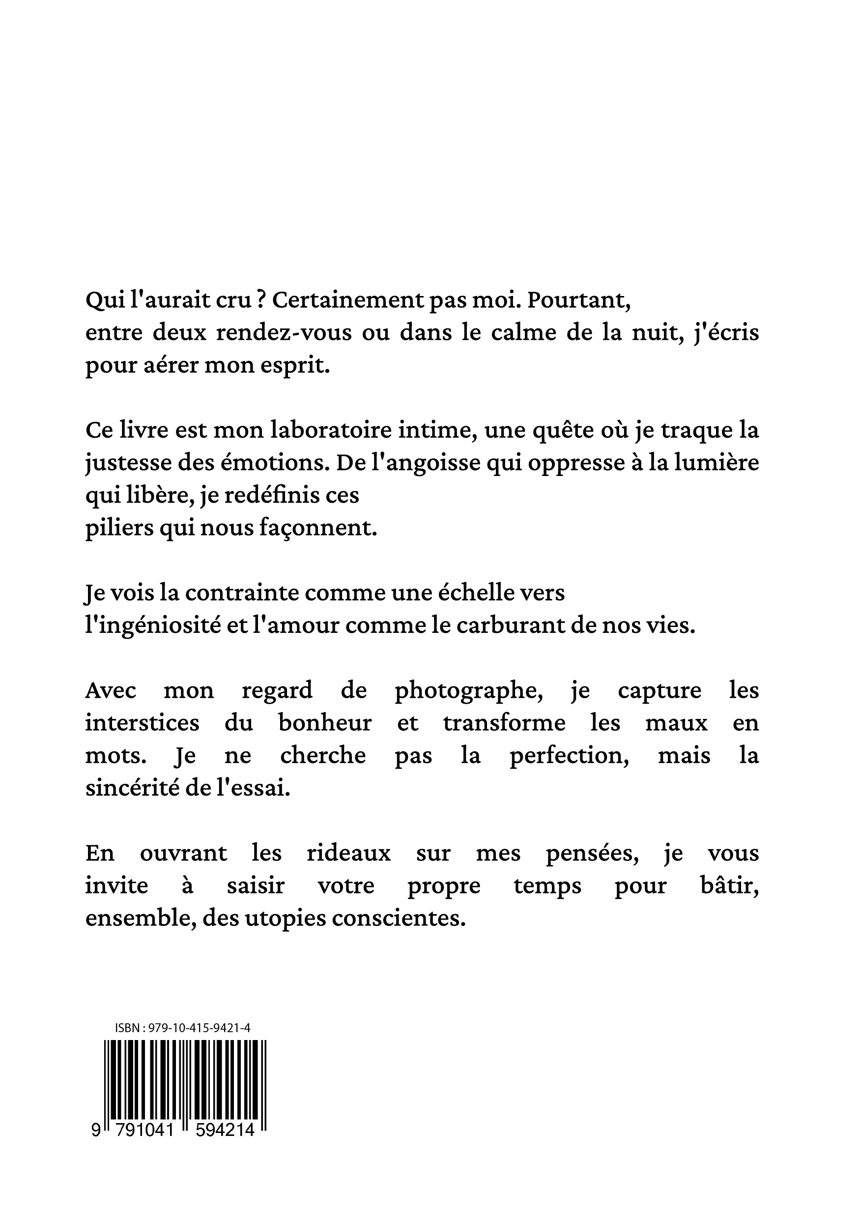 Qui l'aurait cru ? Certainement pas moi. Pourtant, entre deux rendez-vous ou dans le calme de la nuit, j'écris pour aérer mon esprit. Ce livre est mon laboratoire intime, une quête où je traque la justesse des émotions. De l'angoisse qui oppresse à la lumière qui libère, je redéfinis ces piliers qui nous façonnent. Je vois la contrainte comme une échelle vers l'ingéniosité et l'amour comme le carburant de nos vies. Avec mon regard de photographe, je capture les interstices du bonheur et transforme les maux en mots. Je ne cherche pas la perfection, mais la sincérité de l'essai. En ouvrant les rideaux sur mes pensées, je vous invite à saisir votre propre temps pour bâtir, ensemble, des utopies conscientes.