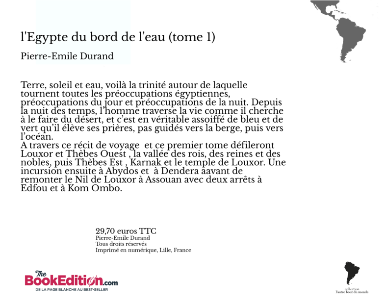 A travers ce récit de voyage et ce premier tome défileront Louxor et Thèbes Ouest , la vallée des rois, des reines et des nobles, puis Thèbes Est , Karnak et le temple de Louxor. Une incursion ensuite à Abydos et à Dendera aavant de remonter le Nil de Louxor à Assouan avec deux arrêts à Edfou et à Kom Ombo.