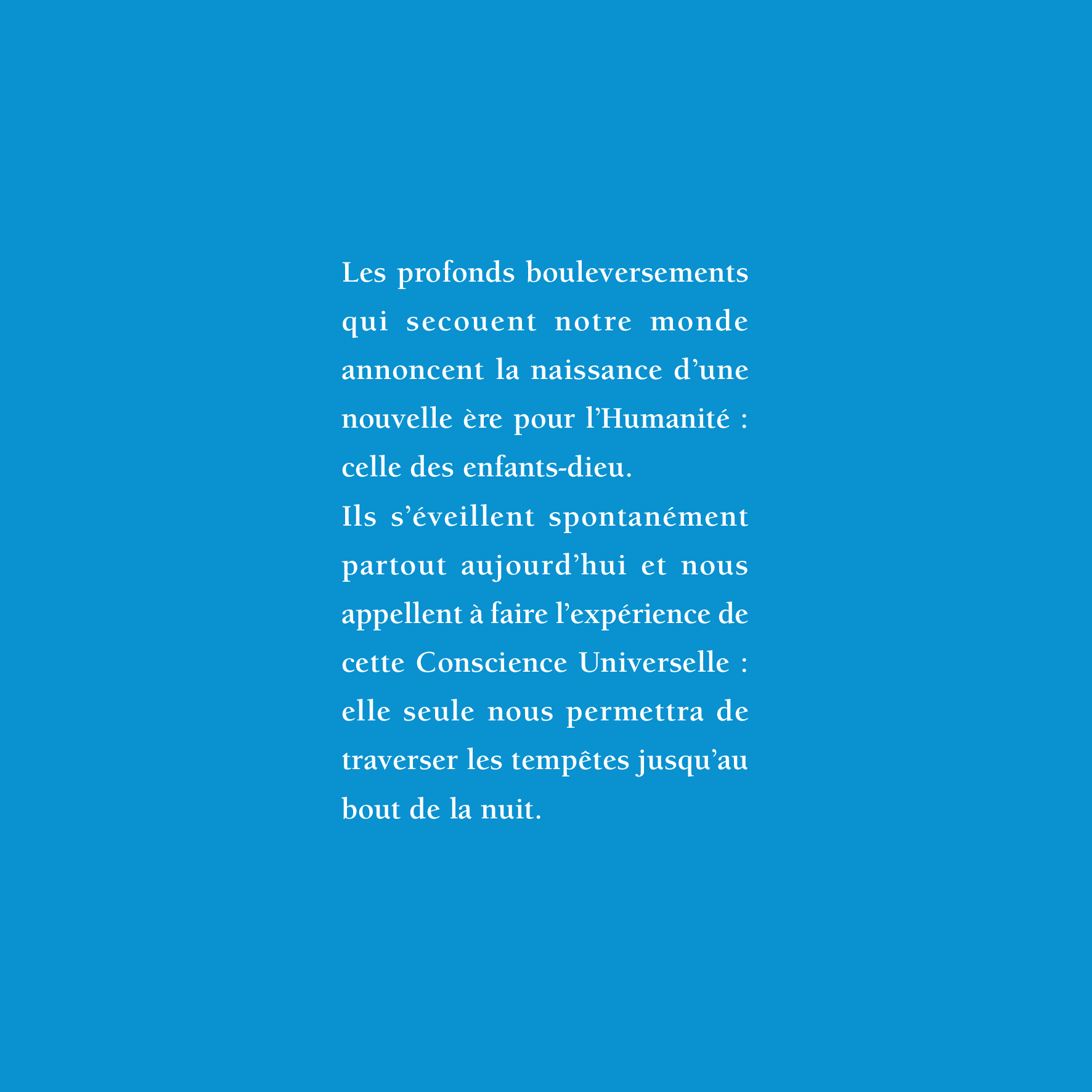 Les profonds bouleversements qui secouent notre monde annoncent la naissance d’une nouvelle ère pour l’Humanité : celle des enfants-dieu. Ils s’éveillent spontanément partout aujourd’hui et nous appellent à faire l’expérience de cette Conscience Universelle : elle seule nous permettra de traverser les tempêtes jusqu’au bout de la nuit.