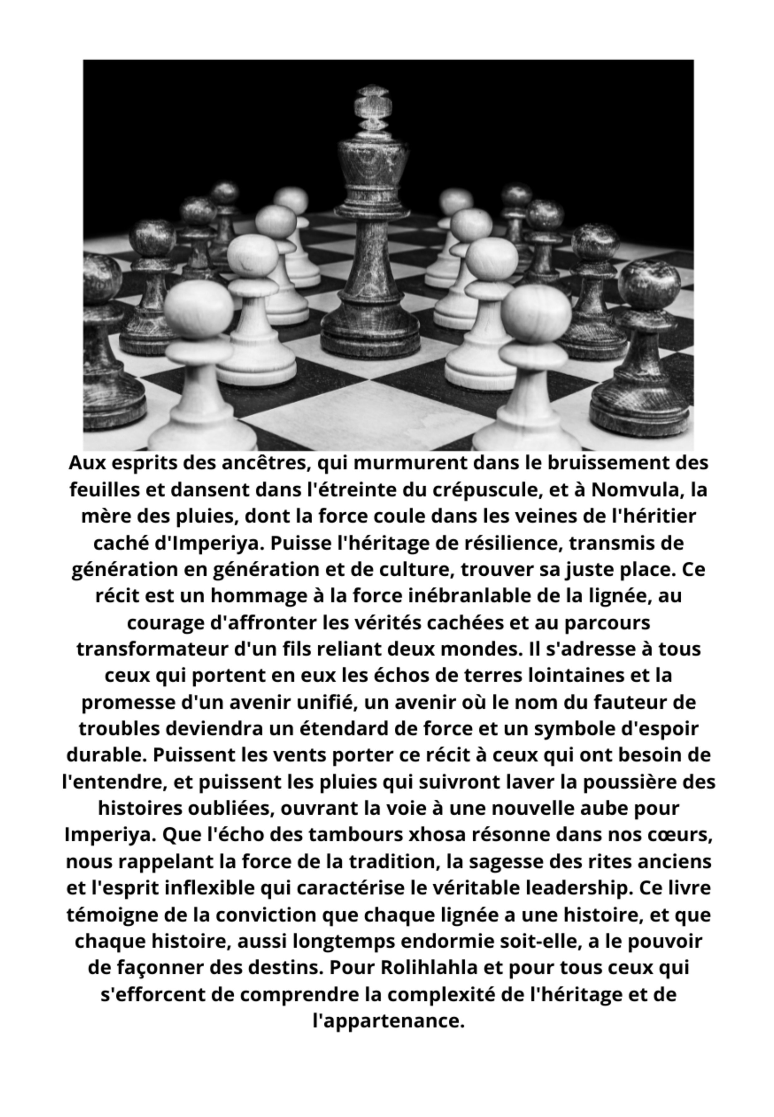 dans une des dernières monarchies du monde du nom de imperiya, le roi sur son lit de mort annonça que ses deux fils connus n'étaient pas ses héritiers car il avait déjà un fils ainé du nom de Rolihlahla qui signifie "fauteur de troubles".avec sa première femme Nomvula qui signifie (mère des pluies),d'un mariage que seul Arthur le grand , son ami d"enfance et meilleur ami connaissait.cette femme vient de la tribu des Xhosa, groupe ethnique du sud de l’Afrique, sont célèbres pour leur système de rites initiatiques, en particulier l’initiation à l’âge adulte par la circoncision. Cela marque un moment essentiel dans la vie d’un homme ou d’une femme. Leur langue est l’une des plus parlées en Afrique du Sud,