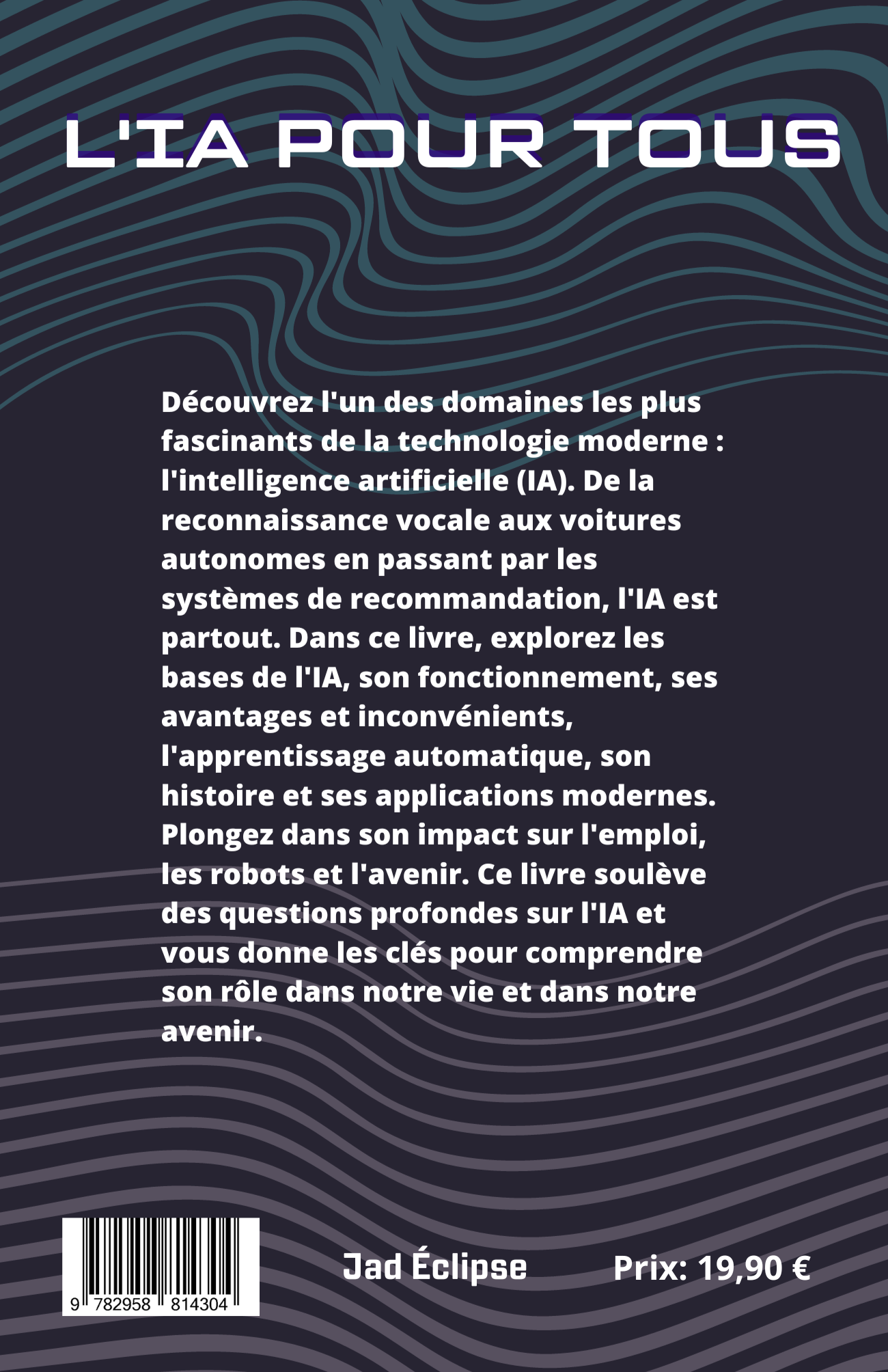 L'IA est un domaine clé de la technologie moderne, présent dans de nombreux domaines, de la reconnaissance vocale aux voitures autonomes en passant par les systèmes de recommandation et de reconnaissance. Ce livre explore toutes les facettes de l'IA, de ses bases à son fonctionnement, de son histoire à ses applications modernes, ainsi que les avantages et les inconvénients de cette technologie en constante évolution. Il examine également l'impact de l'IA sur l'emploi, les robots et l'avenir de l'IA. Les réflexions finales permettent de mieux comprendre les enjeux soulevés par l'IA pour notre avenir. Ce livre vise à offrir une base solide pour comprendre l'IA aujourd'hui et ce qu'elle peut signifier pour l'avenir.