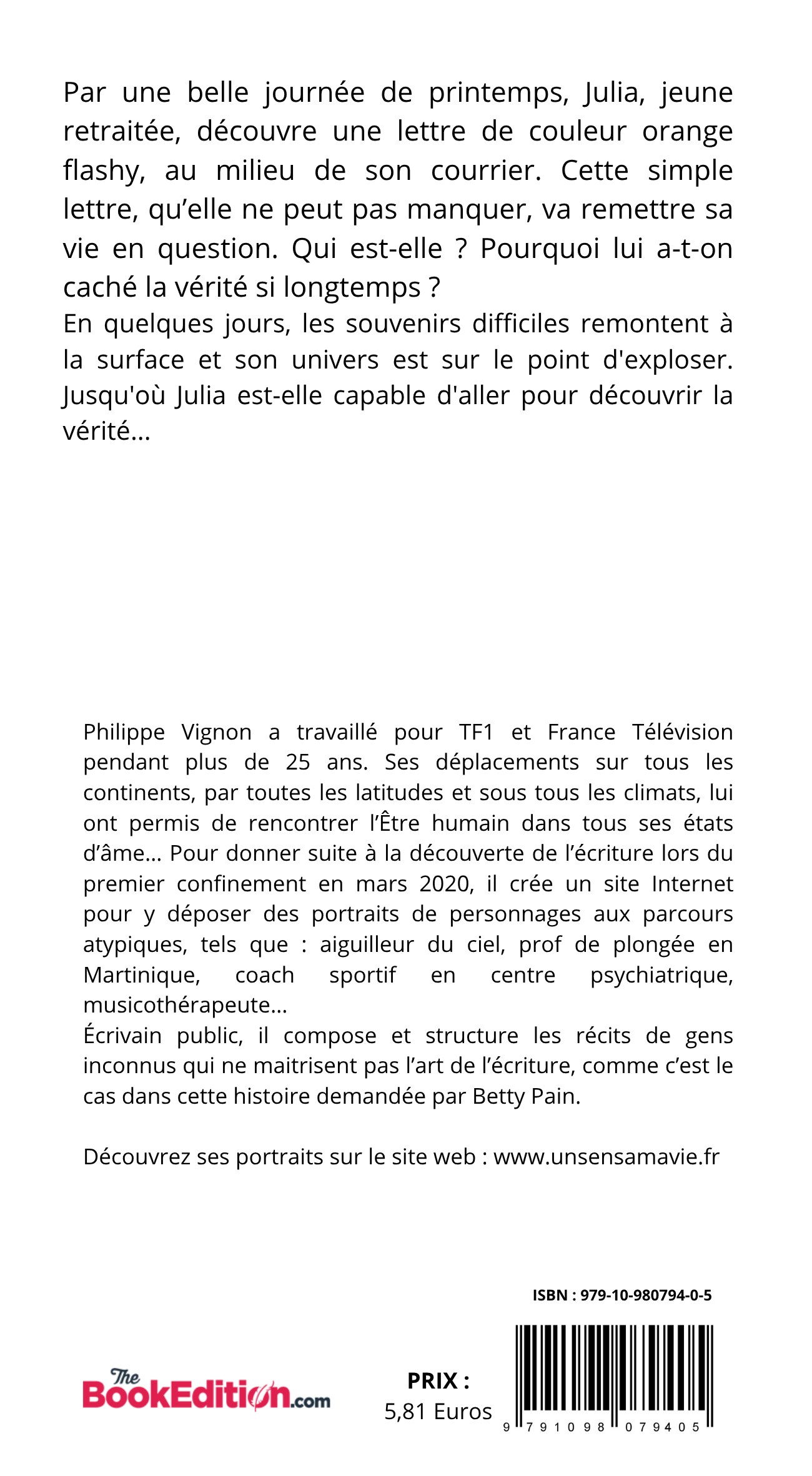Philippe Vignon a travaillé pour TF1 et France Télévision pendant plus de 25 ans. Ses déplacements sur tous les continents, par toutes les latitudes et sous tous les climats, lui ont permis de rencontrer l'Être humain dans tous ses états d'âme… Pour donner suite à la découverte de l'écriture lors du premier confinement en mars 2020, il crée un site Internet pour y déposer des portraits de personnages aux parcours atypiques, tels que : Aiguilleuse du ciel, prof de plongée en Martinique, coatch sportif en centre psychiatrique, musicothérapeute… Écrivain public, il compose et structure les récits d'inconnus qui ne maîtrisent pas l'art de l'écriture, pour leur plus grand plaisir...