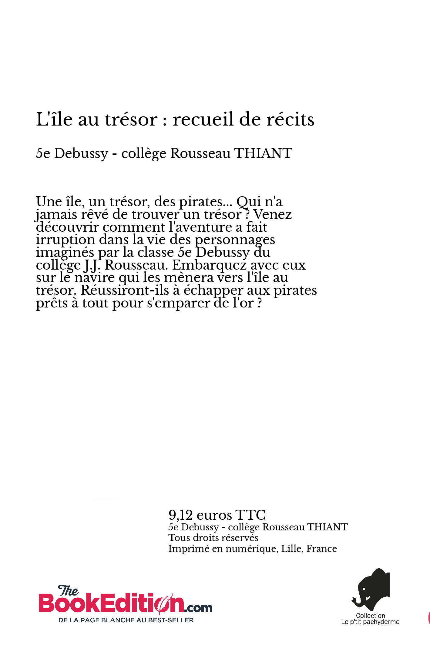 Une île, un trésor, des pirates... Qui n'a jamais rêvé de trouver un trésor ? Venez découvrir comment l'aventure a fait irruption dans la vie des personnages imaginés par la classe 5e Debussy du collège J.J. Rousseau. Embarquez avec eux sur le navire qui les mènera vers l'île au trésor. Réussiront-ils à échapper aux pirates prêts à tout pour s'emparer de l'or ?