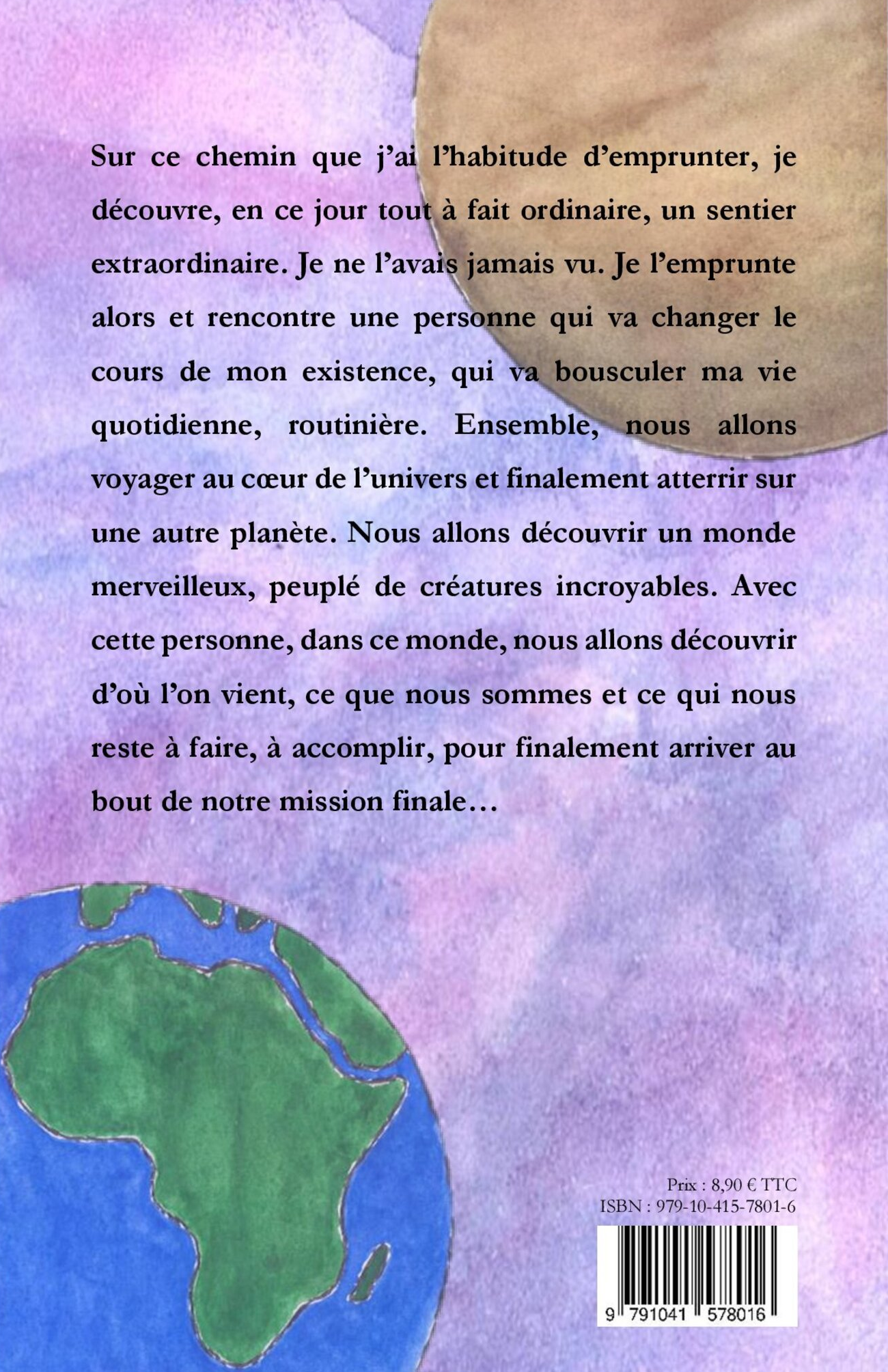 Sur ce chemin que j’ai l’habitude d’emprunter, je découvre, en ce jour tout à fait ordinaire, un sentier extraordinaire. Je ne l’avais jamais vu. Je l’emprunte alors et rencontre une personne qui va changer le cours de mon existence, qui va bousculer ma vie quotidienne, routinière. Ensemble, nous allons voyager au cœur de l’univers et finalement atterrir sur une autre planète. Nous allons découvrir un monde merveilleux, peuplé de créatures incroyables. Avec cette personne, dans ce monde, nous allons découvrir d’où l’on vient, ce que nous sommes et ce qui nous reste à faire, à accomplir, pour finalement arriver au bout de notre mission finale…
