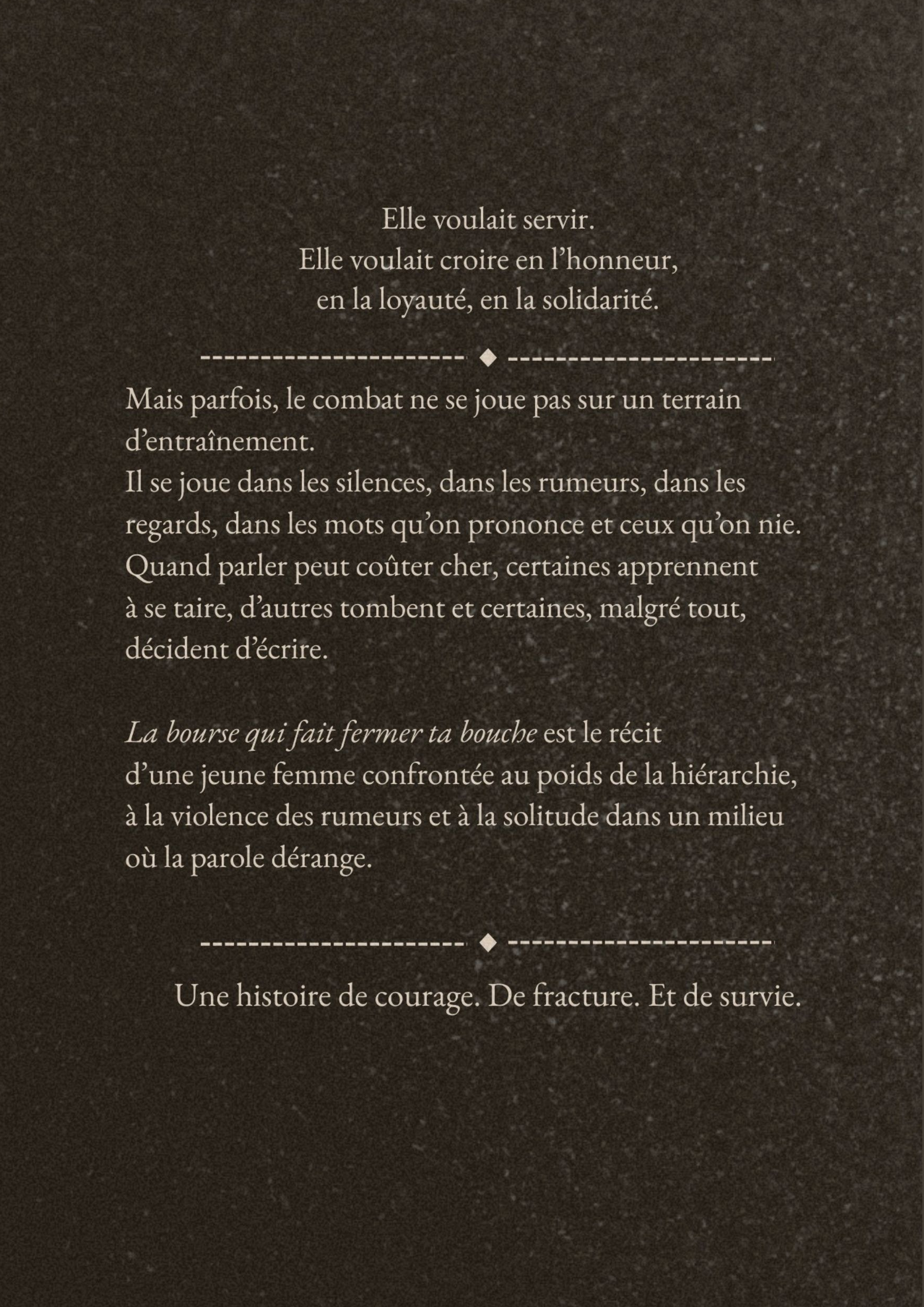 À dix-huit ans, Caroline s’engage avec la conviction que l’effort, la discipline et la loyauté suffisent à trouver sa place. Elle entre dans un univers structuré par la hiérarchie et la réputation, persuadée que le mérite protège et que le silence est parfois une preuve de maturité.