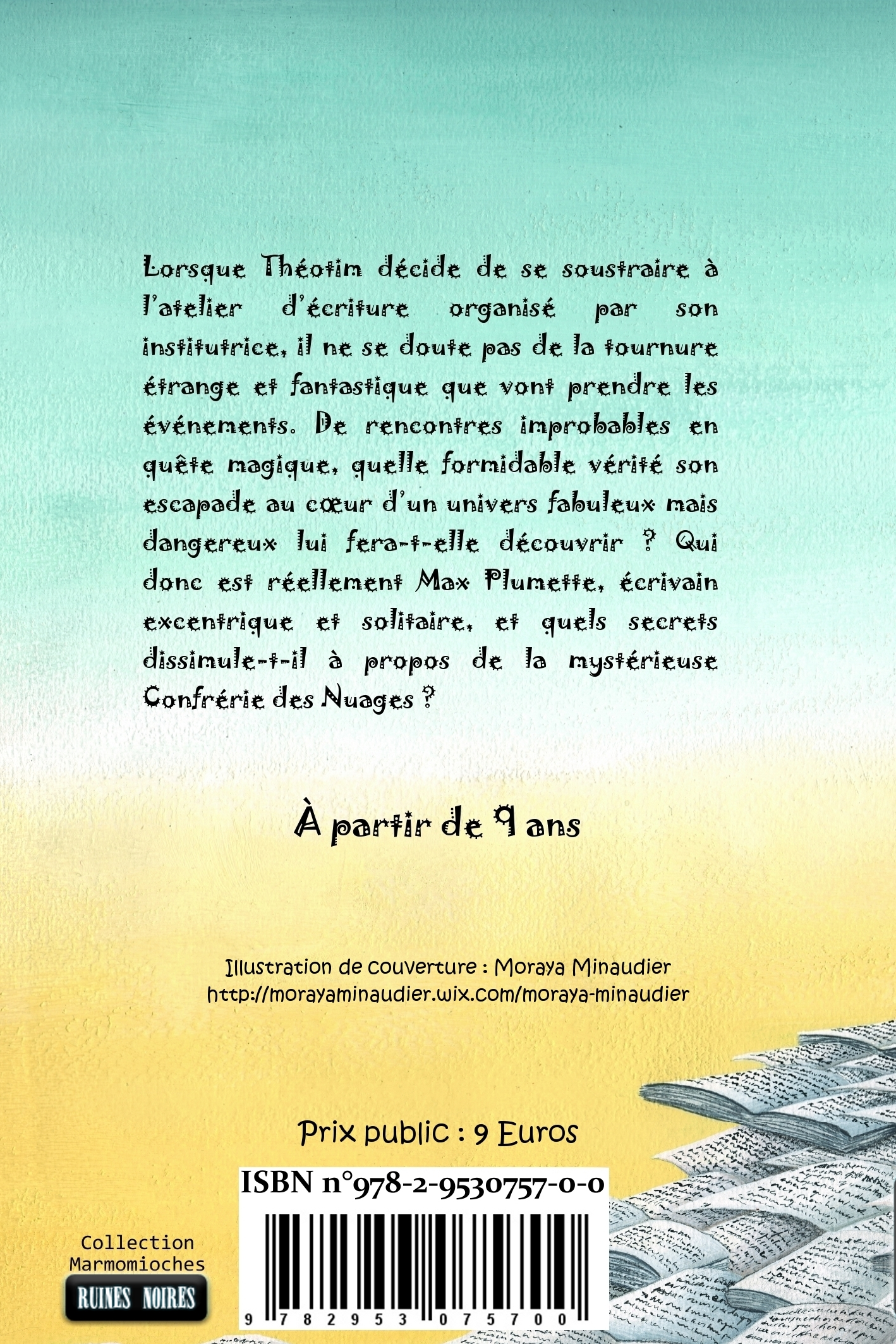 Lorsque Théotim décide de se soustraire à l'atelier d'écriture organisé par son institutrice, il ne se doute pas de la tournure étrange et fantastique que vont prendre les événements. De rencontres improbables en quête magique, quelle formidable vérité son escapade au c??ur d'un univers fabuleux mais dangereux lui fera-t-elle découvrir ? Qui donc est réellement Max Plumette, écrivain excentrique et solitaire, et quels secrets dissimule-t-il à propos de la mystérieuse Confrérie des Nuages ?