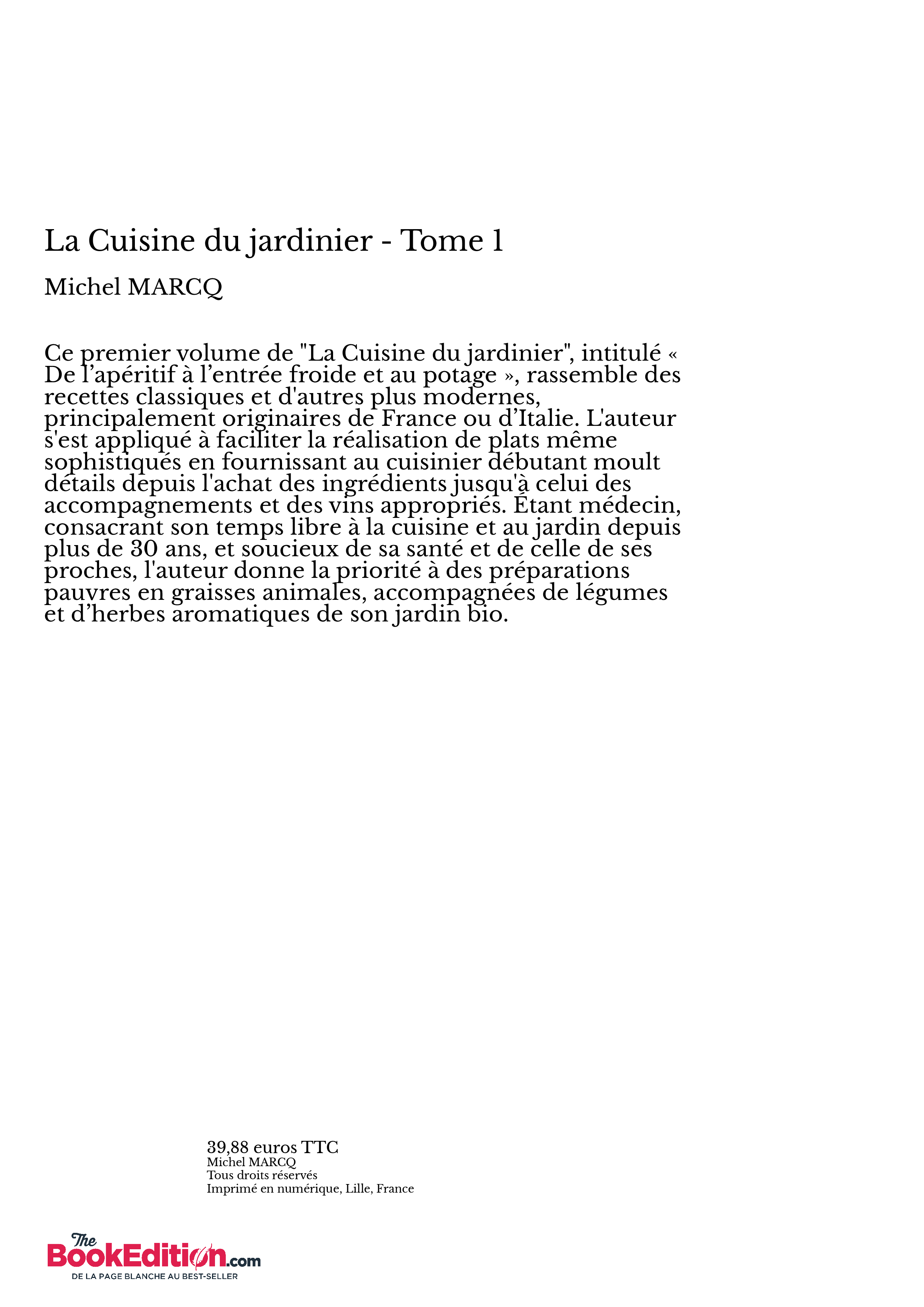 Ce premier volume de "La Cuisine du jardinier", intitulé « De l’apéritif à l’entrée froide et au potage », rassemble des recettes classiques et d'autres plus modernes, principalement originaires de France ou d’Italie. L'auteur s'est appliqué à faciliter la réalisation de plats même sophistiqués en fournissant au cuisinier débutant moult détails depuis l'achat des ingrédients jusqu'à celui des accompagnements et des vins appropriés. Étant médecin, consacrant son temps libre à la cuisine et au jardin depuis plus de 30 ans, et soucieux de sa santé et de celle de ses proches, l'auteur donne la priorité à des préparations pauvres en graisses animales, accompagnées de légumes et d’herbes aromatiques de son jardin bio.