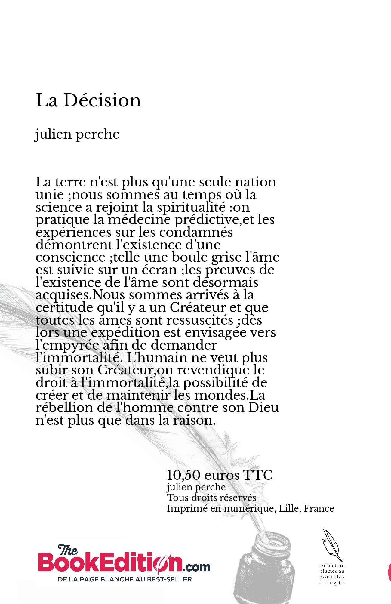 La terre n'est plus qu'une seule nation unie ;nous sommes au temps où la science à rejoint la spiritualité :on pratique la médecine prédictive,et les expériences sur les condamnés démontrent l'existence d'une conscience ;telle une boule grise l'ame est suivie sur un écran ;les preuves de l'existence de l'ame sont désormais acquises.Nous sommes arrivés à la certitude qu'il y a un Créateur et que toutes les ames sont rssuscités ;dès lors une expédition est envisagée vers l'empyrée afin de demander l'immortalité.L'humain ne veut plus subir son Créateur,on revendique le droit à l'immortalité,la possibilité de créer et de maintenir les mondes.La rébellion de l'homme contre son Dieun'est plus que dans la raison,elle est aussi dans l'acte.Arrive le moment où l'on prend un espace,à l'interieur duquel,on trtavaille le temps et nous voilà dans le monde des paradis et des enfers ;un prophète nous accueille et nous invite à revenir d'où nous venons : »toute ame doit gouter à la mort » dit il ;refusant d'obtempérer,nous nous avançons à travers des enfers,où les damnés consumés par des remords,nous accueillent en sauveur'Nous traversons des paradis,où des bienheureux s'étonnent de notre visite'